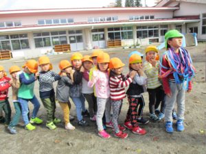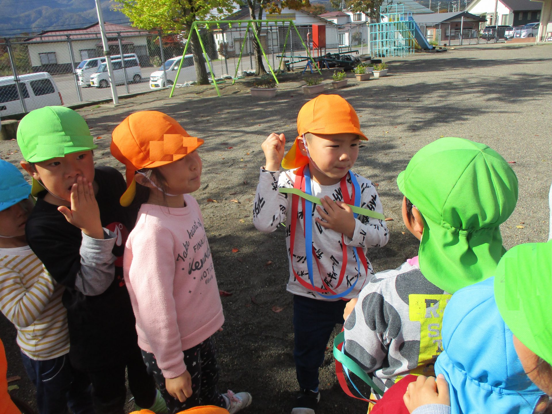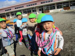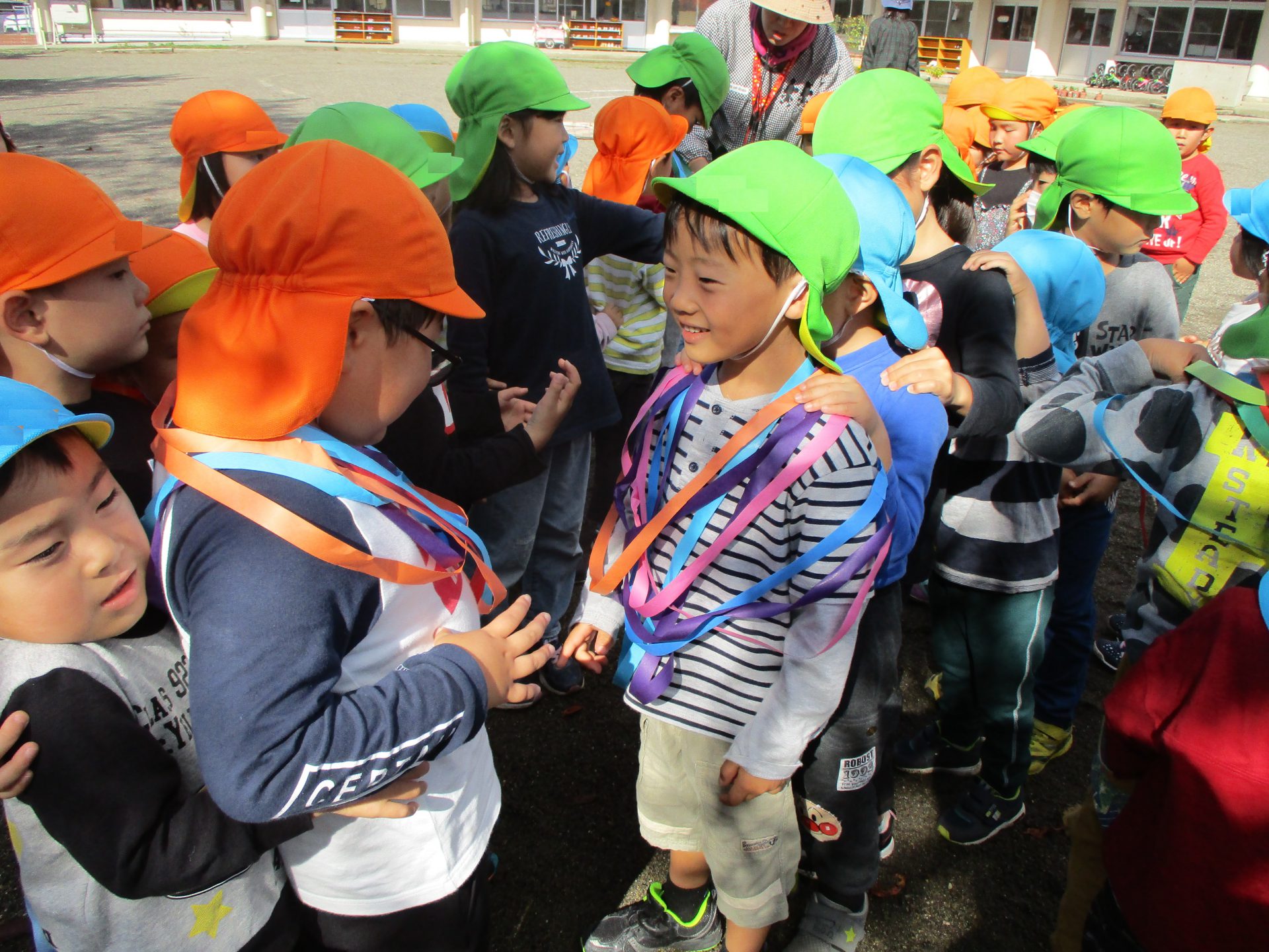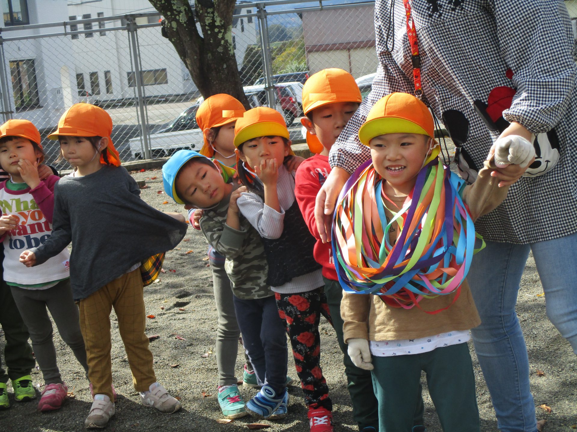 火がおきになるまで、やきいもグーチーパーで遊びました。年少さんとペアになった年長さんは目線の高さを低くして話しかけたり、手をつないで一緒に移動したり、優しい姿に年少さんも安心です♪