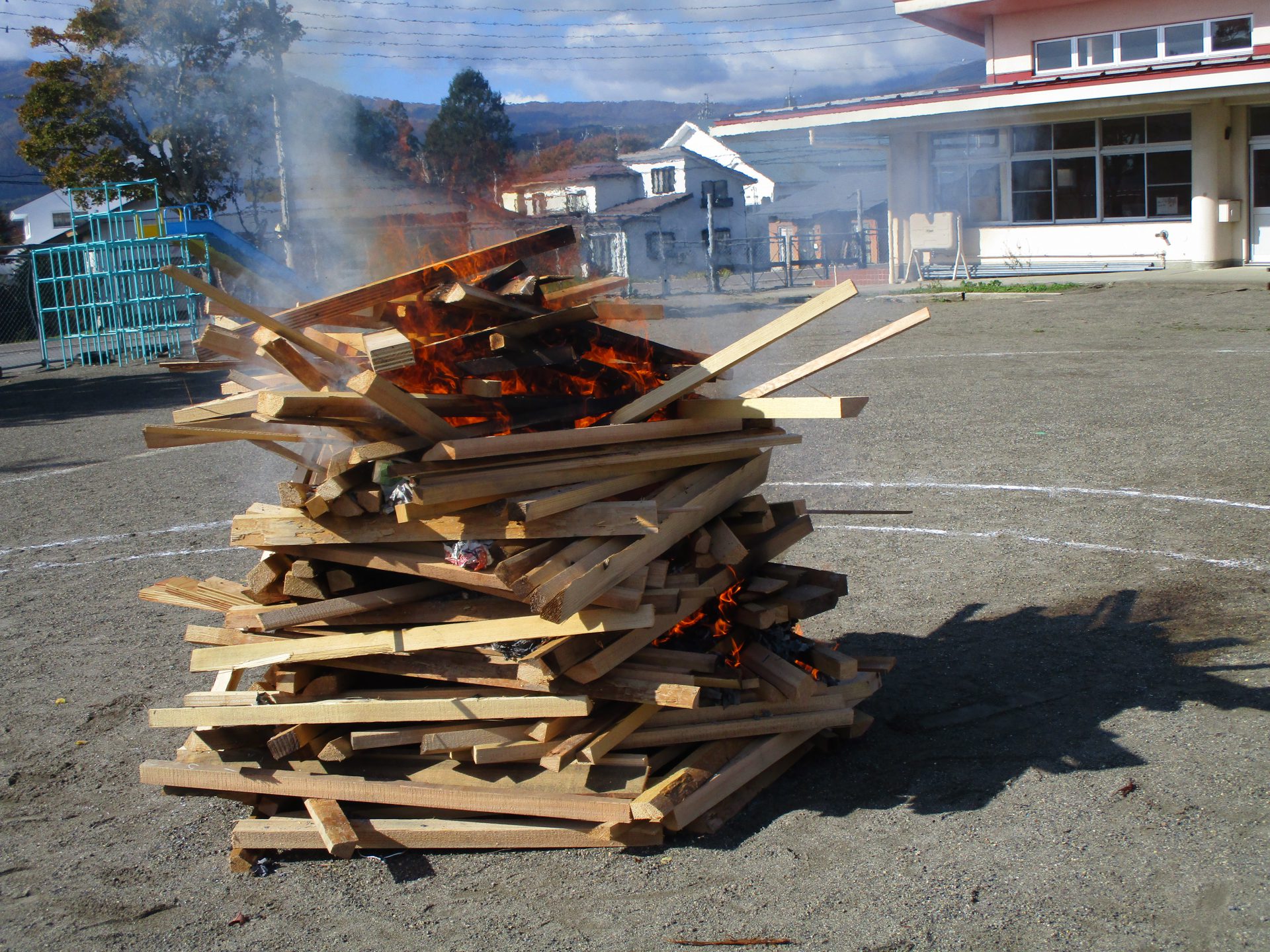 子ども達は火が燃えていく様子に釘付けです。保育士「あのもくもくってしてるのは何かな??」と聞くと年少さんは「うーん・・・ゆげ!!」と一言。それを聞いて「え?あれゆげじゃないよね?けむりだよね?」「うんうん!」と年中さん。子ども同士の会話を聞いていてこちらも楽しくなりました。