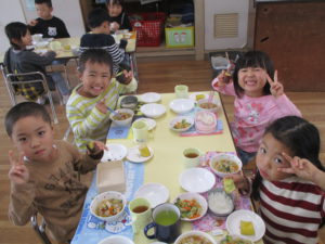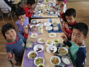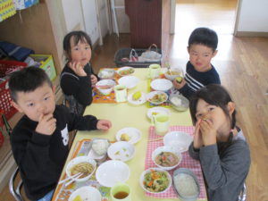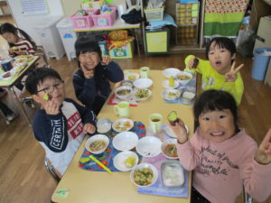 配膳するときから、やきいものいい匂いがほわほわ~っと部屋中漂い、「あ~いいにおい!」「おなかすいた!はやく食べたいね。」と楽しみにしていました。そんな子どもたちの気持ちを受け止めながらもせっかくなので、よーく見てみたり、近くで嗅いでみたりするのも楽しいよ♪と話すと、「わぁ近くで嗅ぐともっといい匂いするね!」「こげたところは苦いなぁ」と新たな発見を楽しみ友達同士で味わっていました。