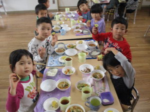 「この袋おさえているから、そのすきに入れて!」「ありがとう!」と、こちらが声を掛けたり、手伝ったりしなくても、年長さんが気づいてすかさず声を掛けていました。さすが年長さん。その姿を見て、友達に同じことをやってあげようとする姿も・・・。こういうちょっとした関わりで子ども達は吸収しているんですね!