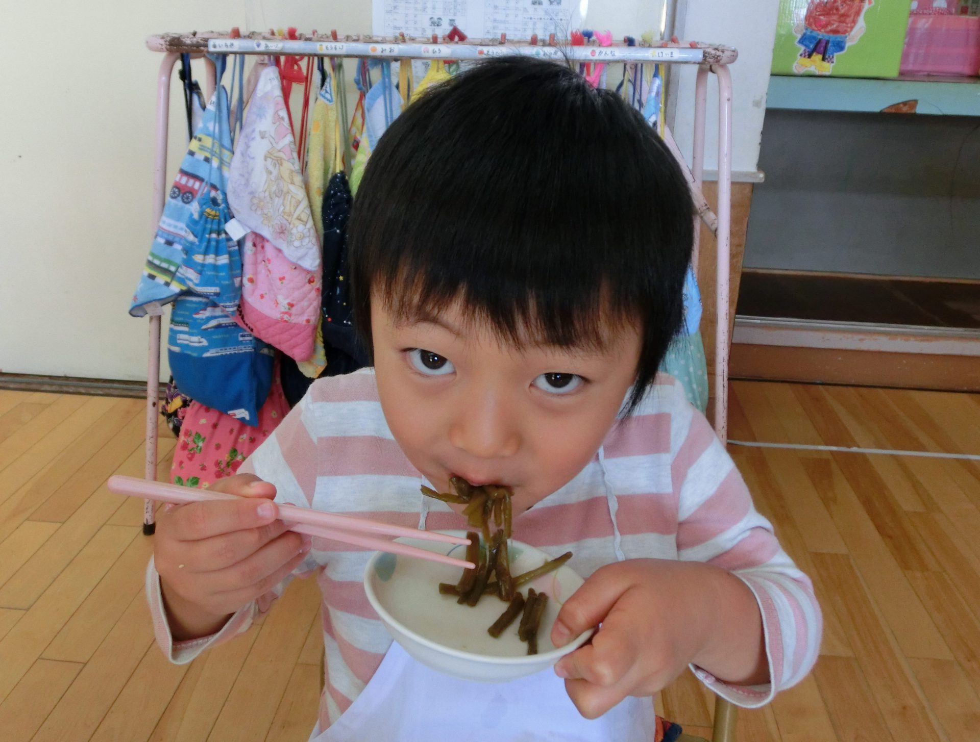 「今日の給食は、さつまいものつるのきんぴらがあります」