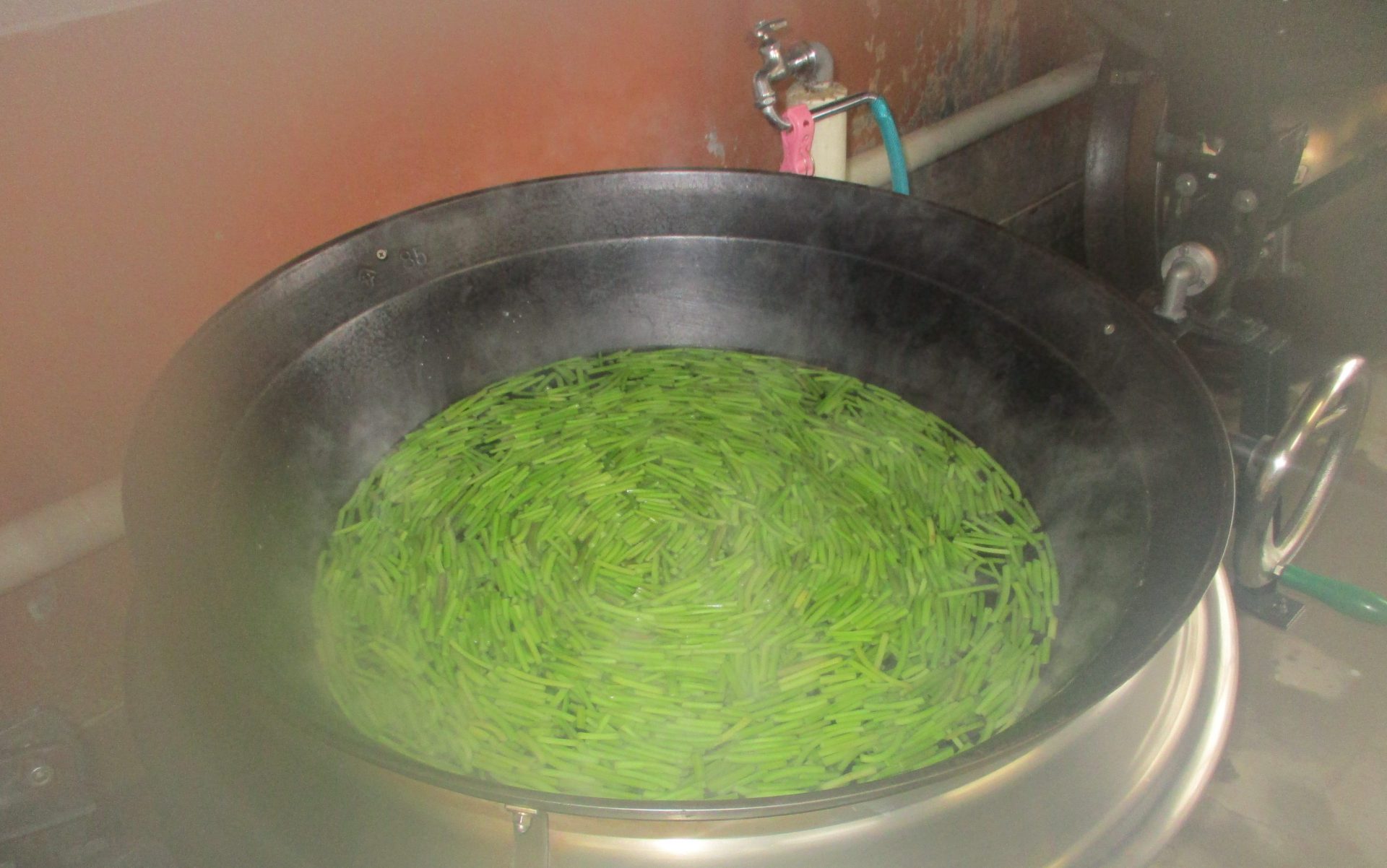 つるの柔らかそうな部分を食べやすい長さに切ったら、よく洗って大きなお釜で茹でます。