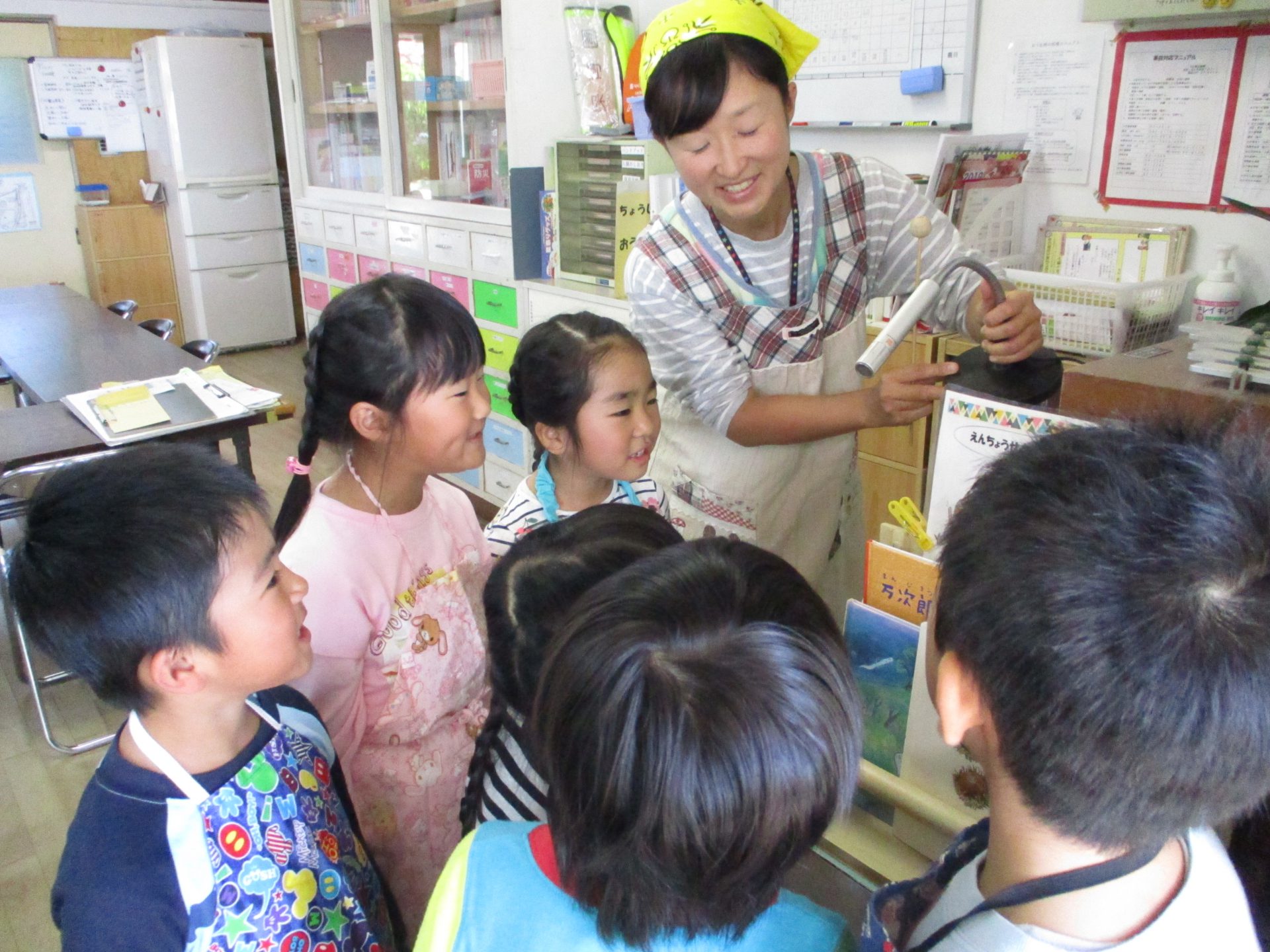年長組のお当番が、放送でお知らせをします。