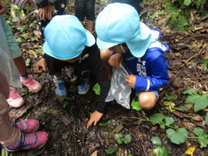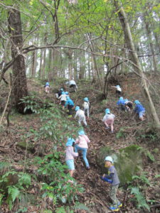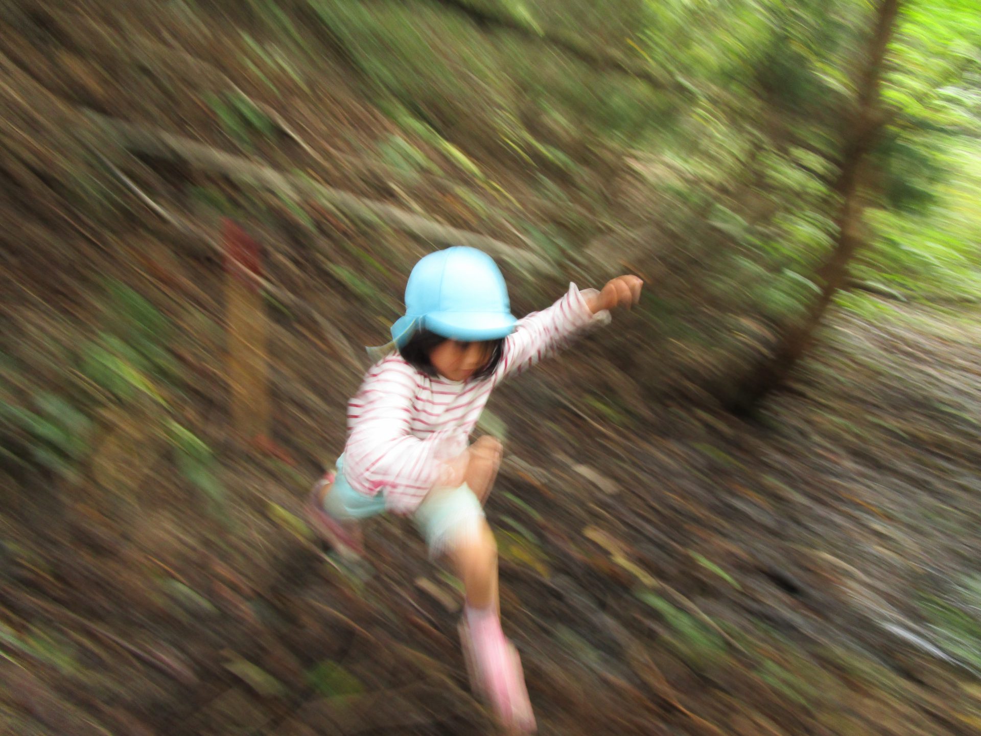 ・初めて登ってみた急斜面は地面が湿っており滑りやすかったけど、両手足を使いながら登れそうな道を探しながら全員が登りきった。体を全身で支えながら登ったり、頭を使ったりするいい経験ができたように思う。これらの経験から登れたことで満足、達成感に繋がるのだなあと感じた。