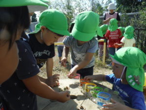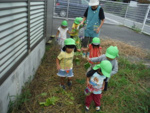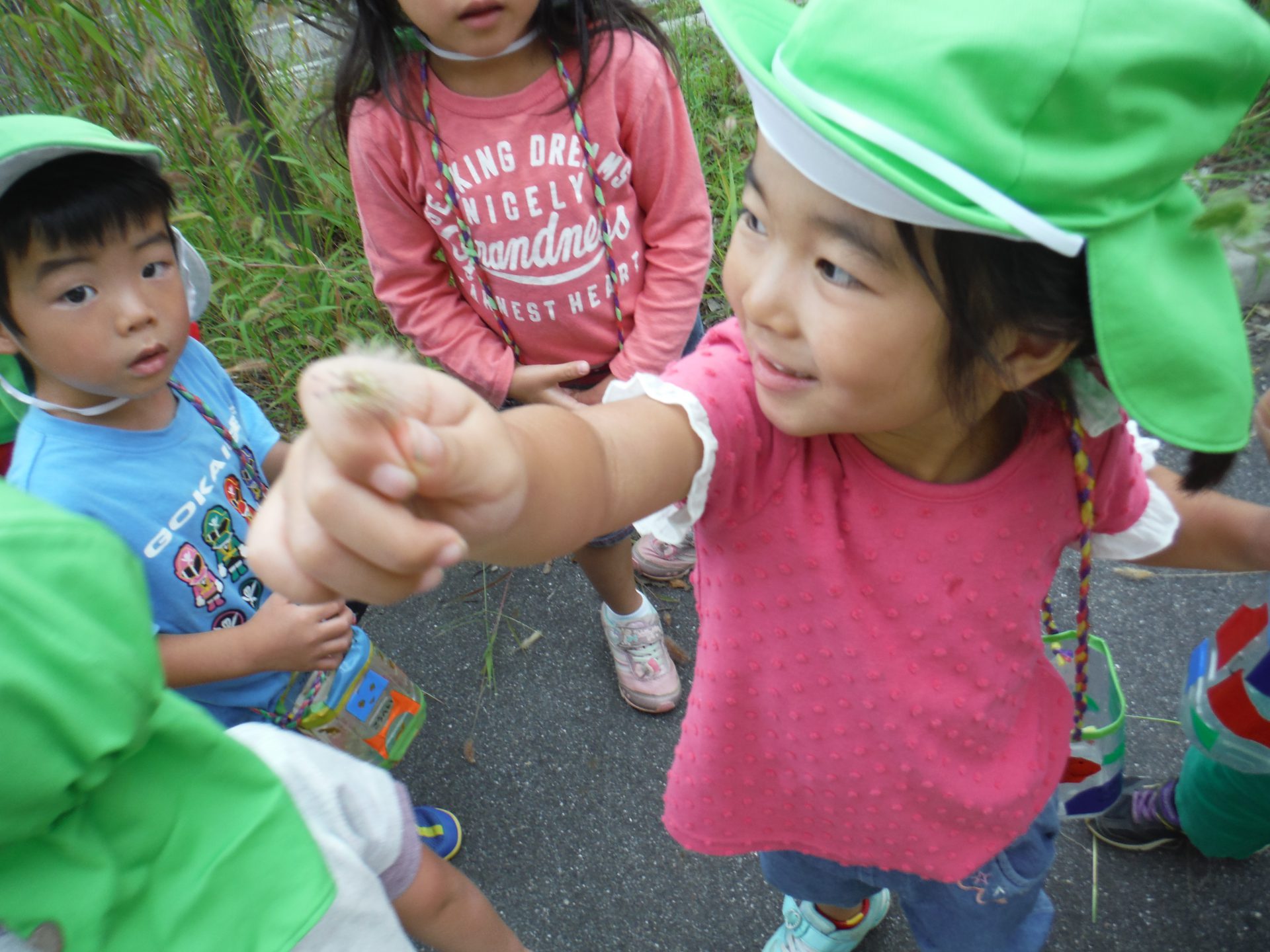 満足気な子どもたちを見て遠くまで行かなくても、おもちゃがなくてもこんなに子どもたちの表情がキラキラしていて嬉しく感じました。身近な自然の中でたくさんの発見を友だちと一緒に共有したり驚いたりしながら秋の自然を心で感じていっぱいあそんでいきたいと思います。