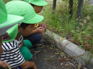 普段はなかなか行かない園の裏側。「今日はみんなで探検!!」とお散歩バックを持って行ってみると・・・