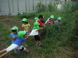 畑の一部が夏にたくさん降った雨で草が伸びてジャングルのようになっていました。何か出てきそう・・・とドキドキしながらジャングルの道を通ってみました。運動会ごっこで綱引きをしたこともあり、綱引きも始まりました。