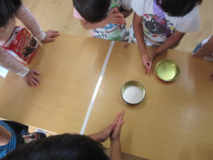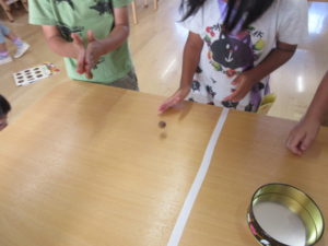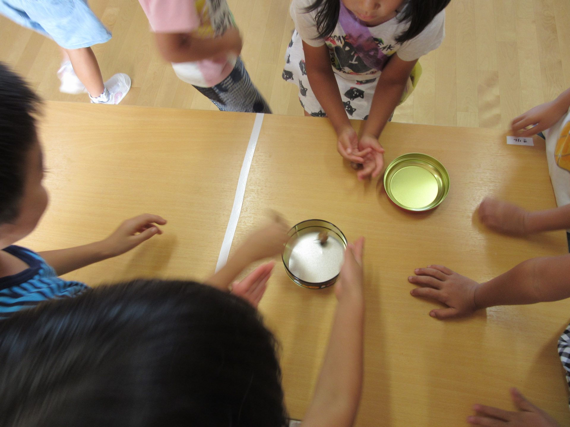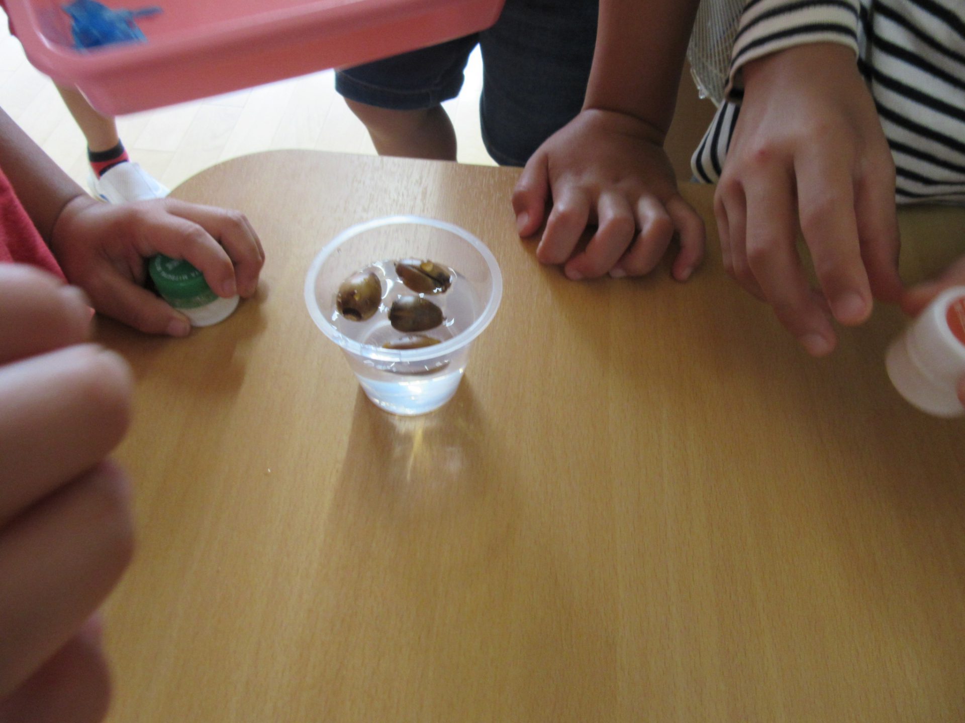 虫さんがドングリの中身を食べて、ドングリが軽くなり水に浮くことを話すと、早速やってみる子ども達。