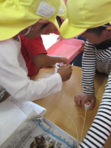 見つけたドングリや落ち葉について、絵本の中で知ったことを通し、試したり、遊びに取り入れている子ども達です。
