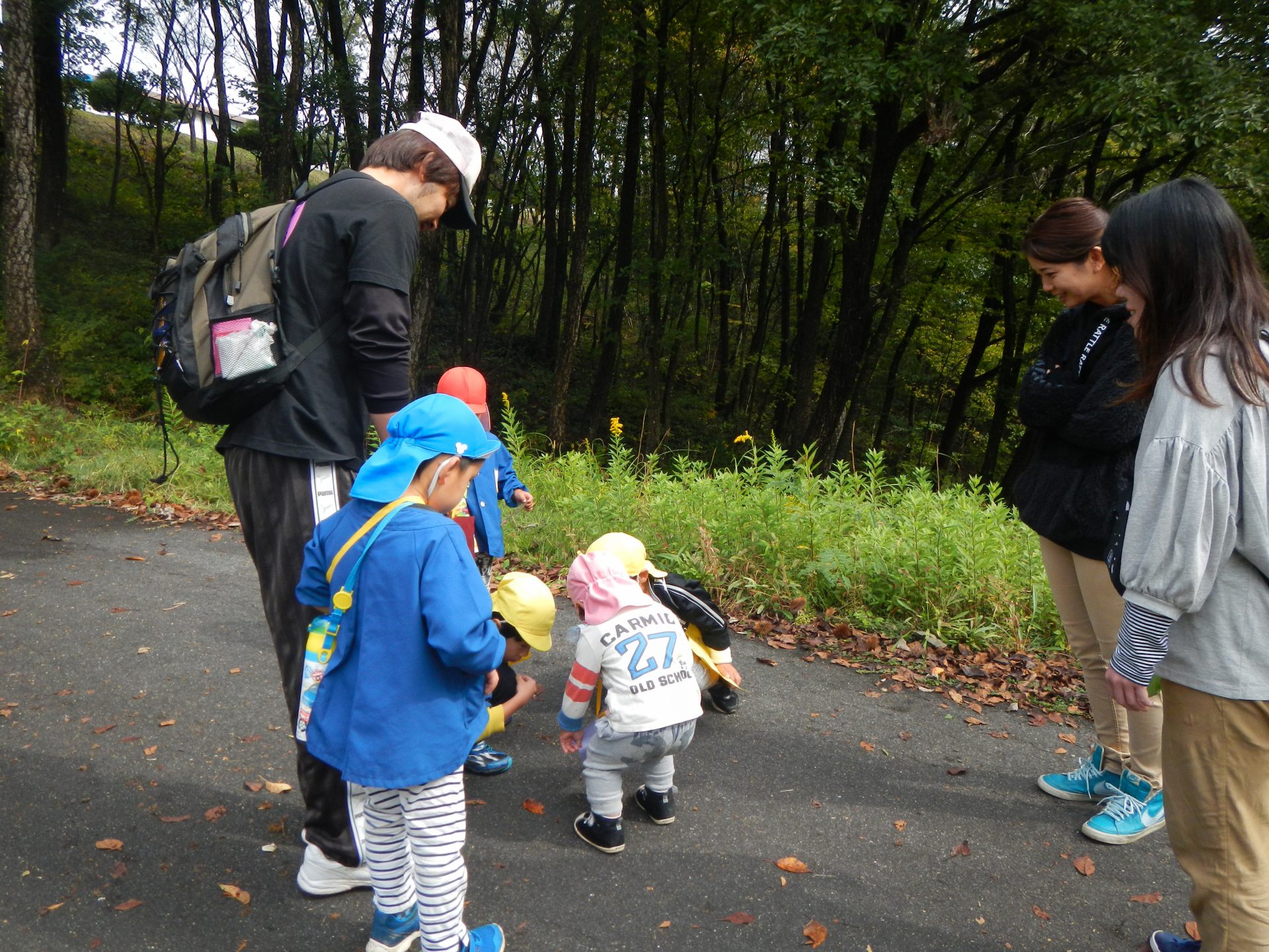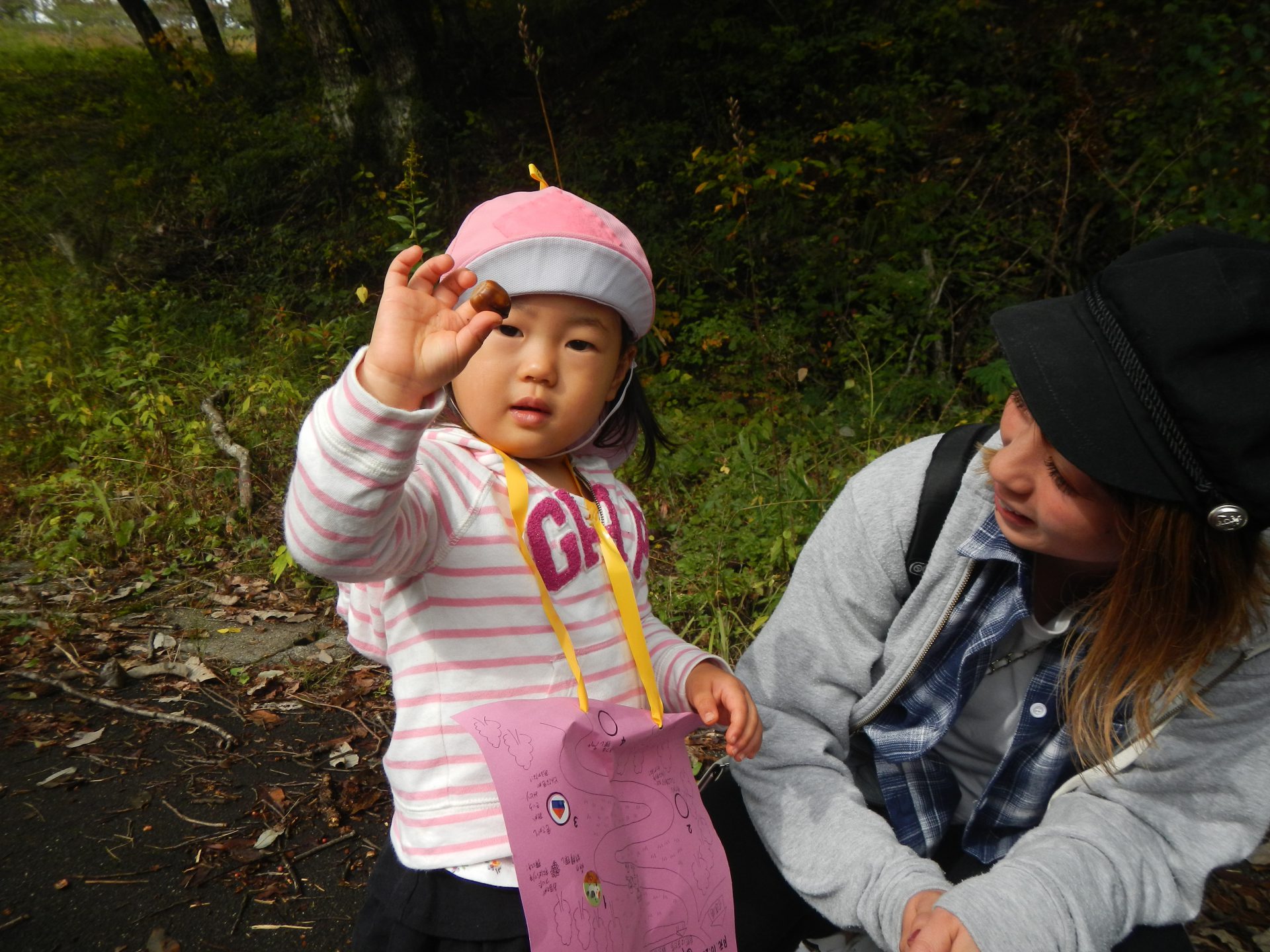 「どんぐりみつけたー!」と未満児さんも自然に触れて遊んでいました。