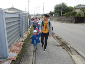 土曜参観日で自然の中で遊ぶことが大好きな子ども達は保護者と一緒に、ネイチャーゲームをしました。会場は飯田市の運動公園。保育園から公園まで保護者と一緒に歩いていきました。