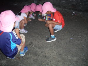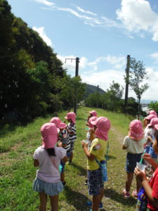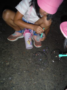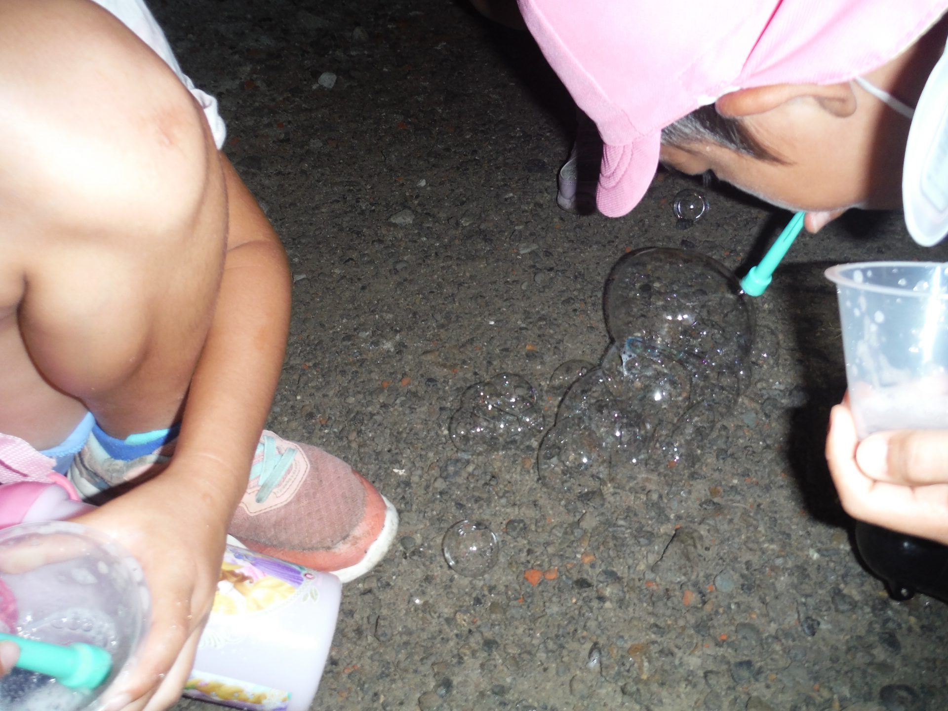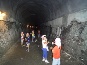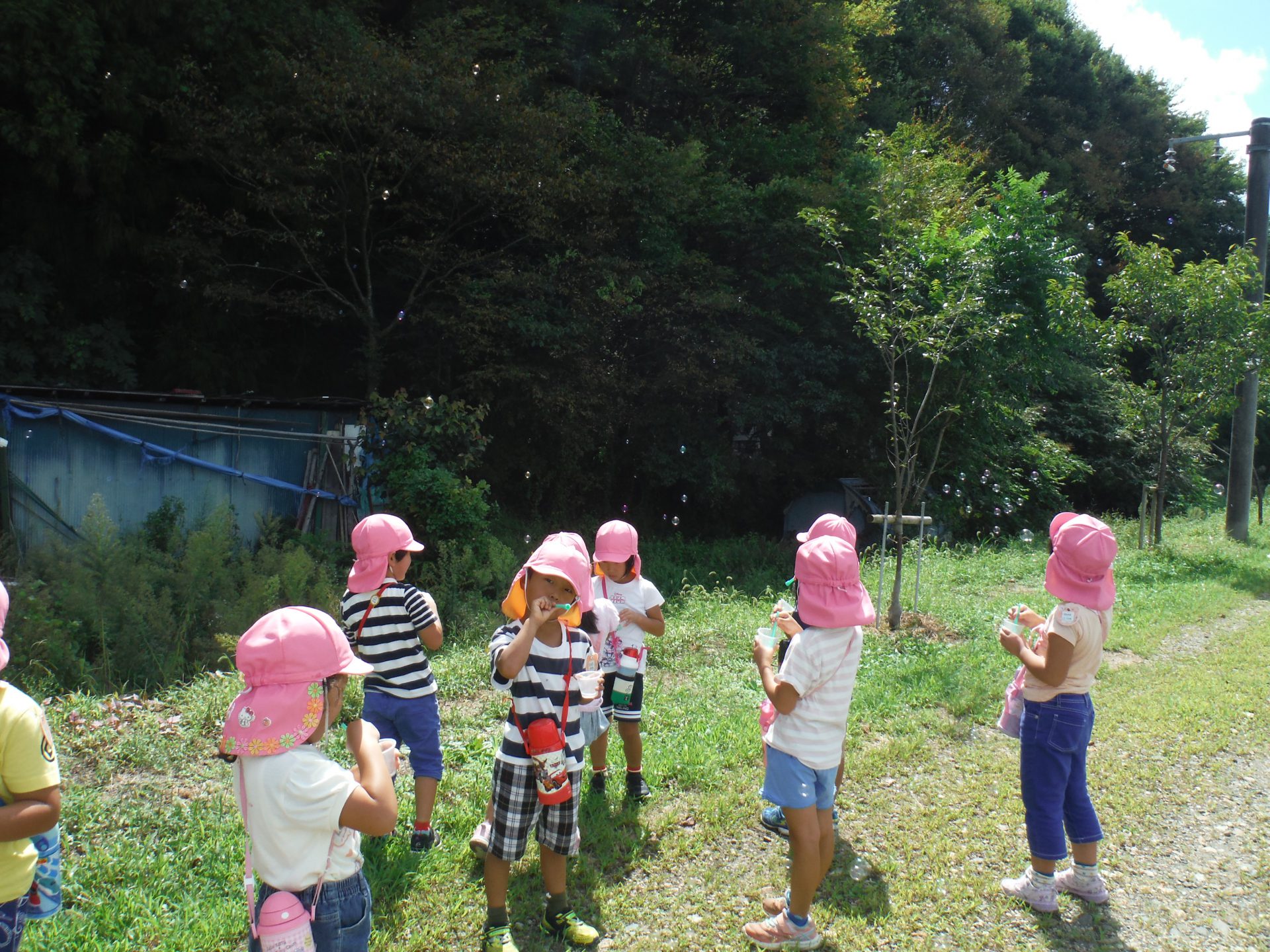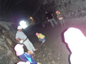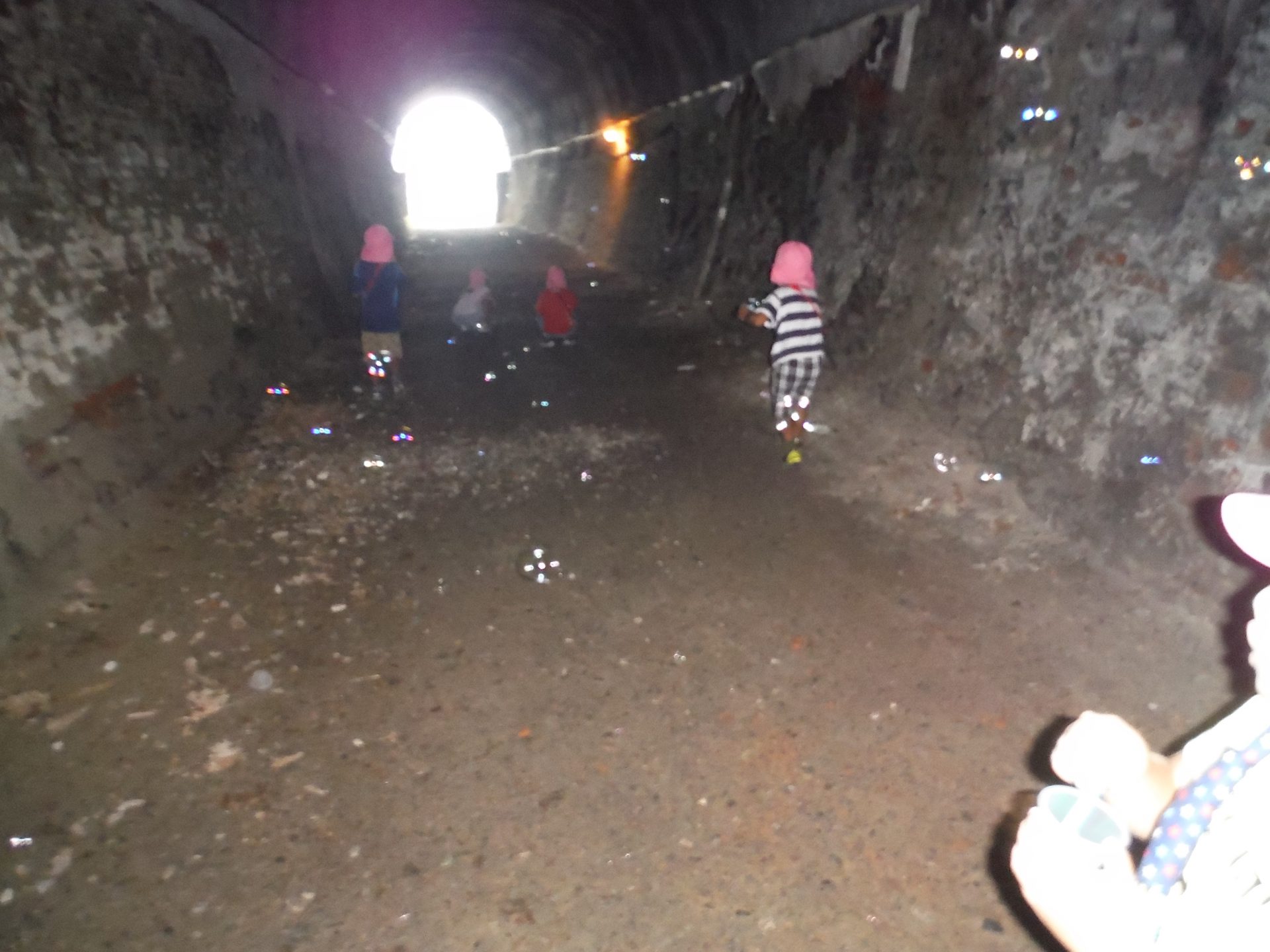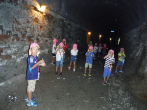 いつも行く場所だけど、あの大自然の中で楽しんでほしいなと思って、シャボン玉を持っていきました。山の上やトンネルの中、自然の中でシャボン玉を楽しみながら、いろいろ試したり、発見する子どもたちの姿が見られました。暗いトンネルの中で、シャボン玉をとばしら初めてのことだらけで発見もいっぱいありました。