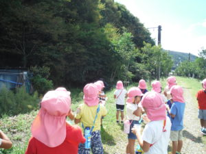 廃線敷きへ行こう!!といつものように子どもたちは水筒を持ち、保育士はリュックを背負って出かけました。リュックの中には、何が入っているのかな?・・・