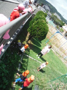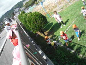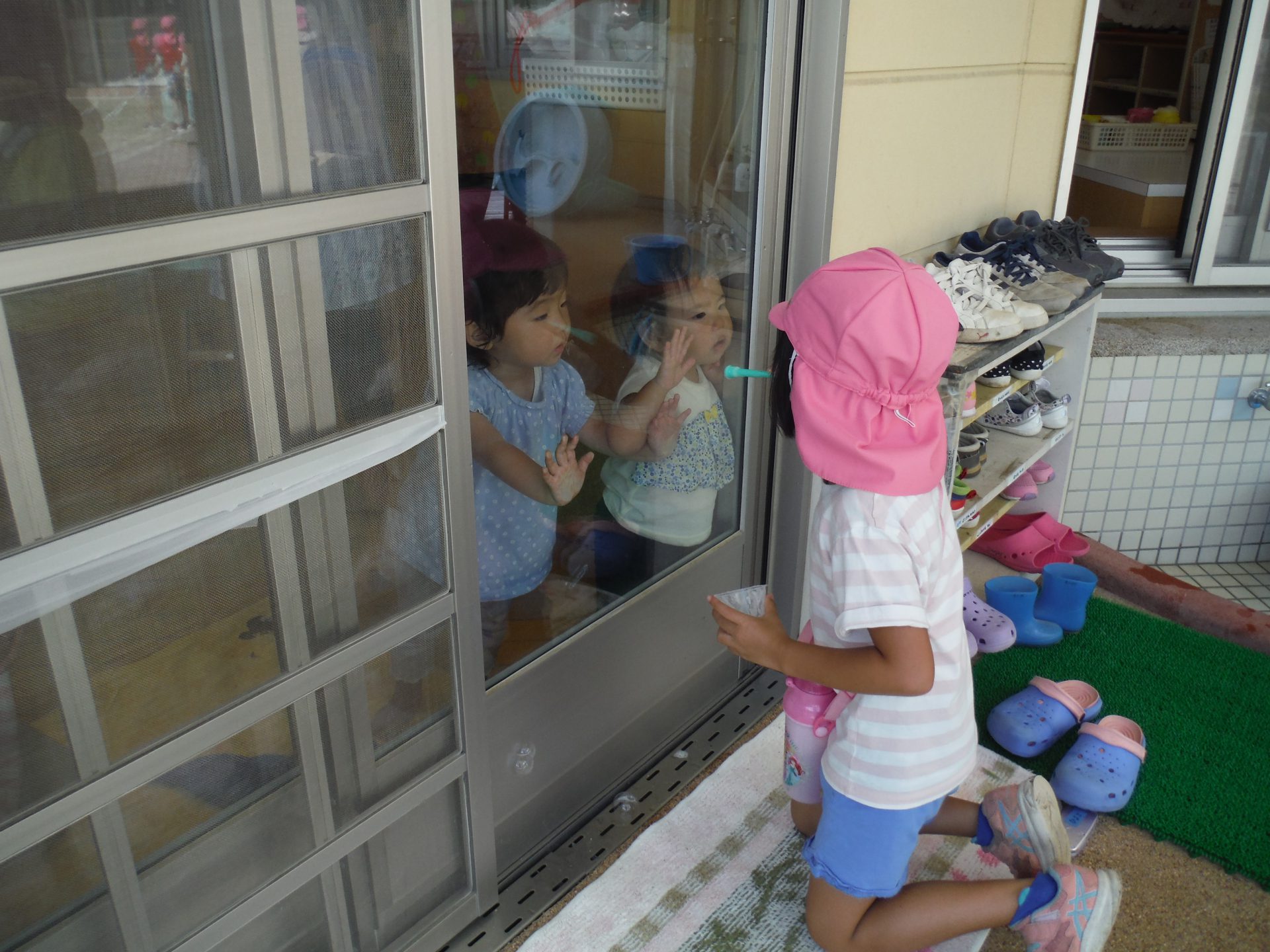 帰りに、園庭の上から2才のお友だちに…「ふーっ」