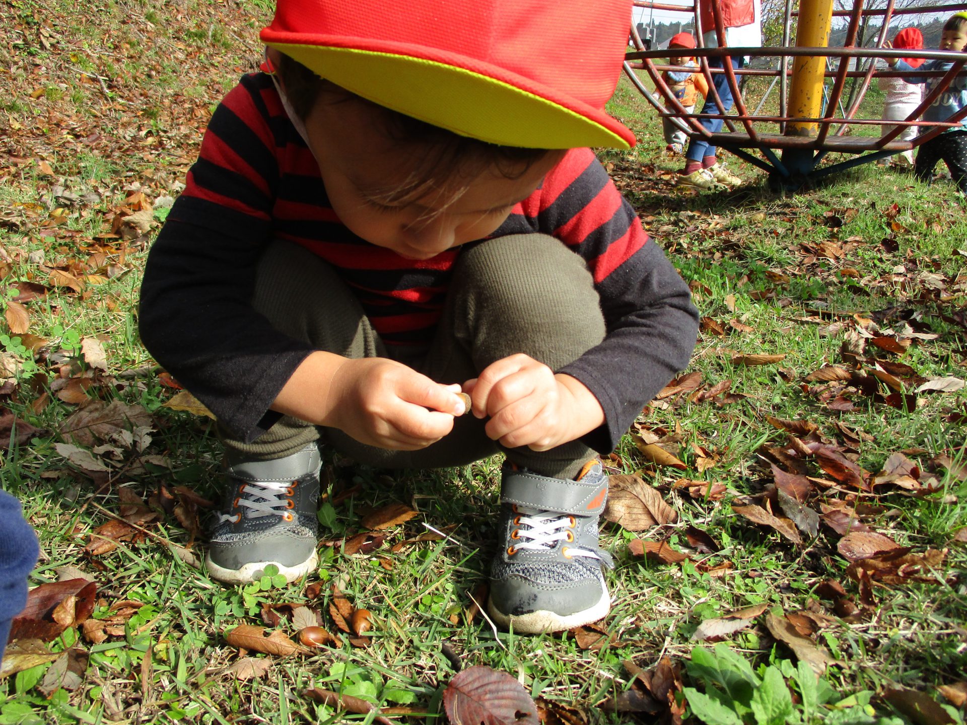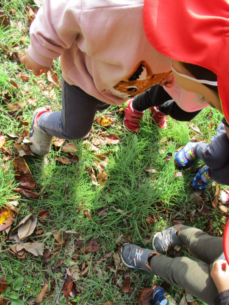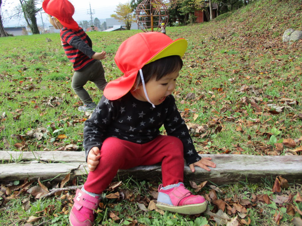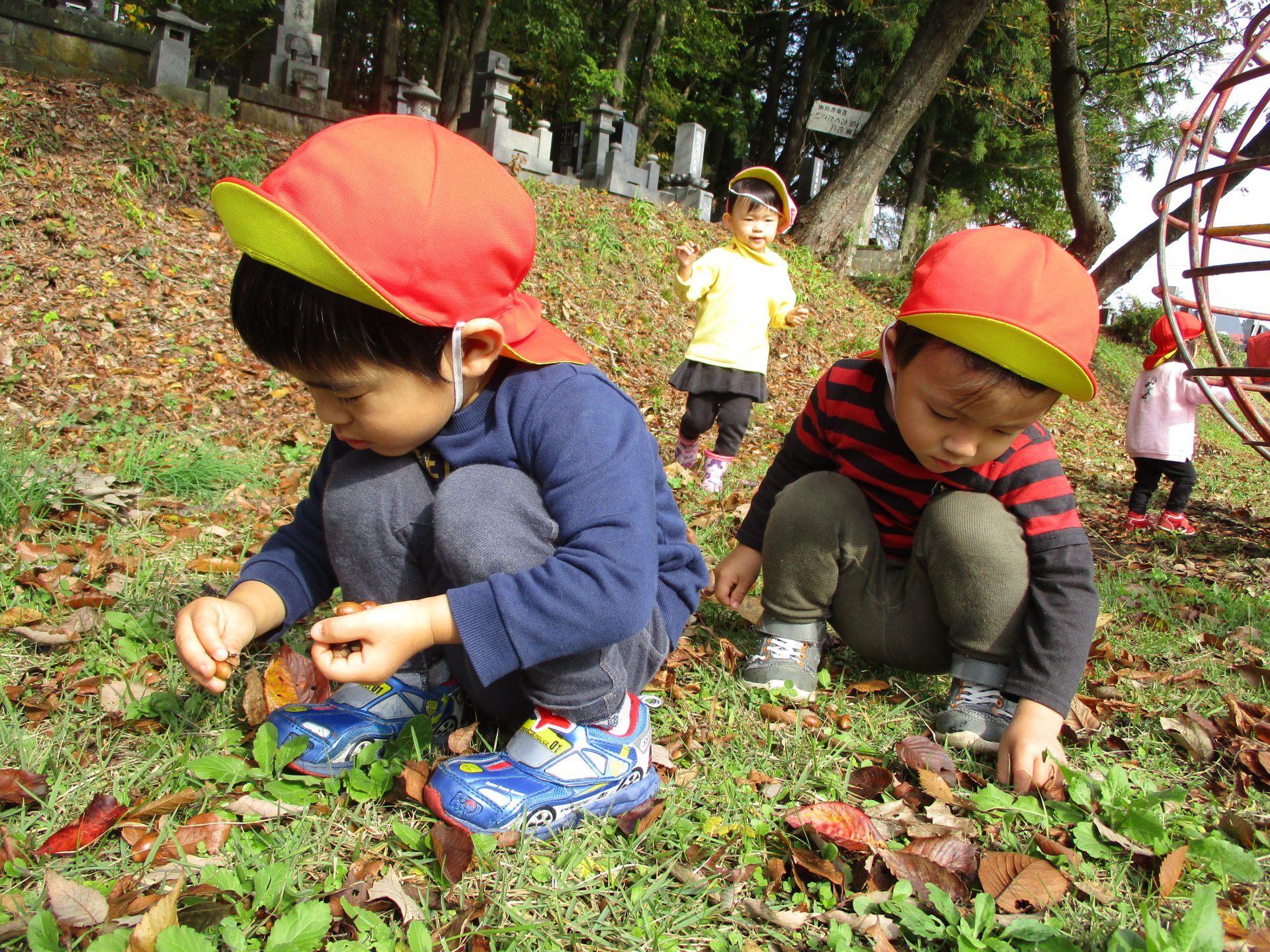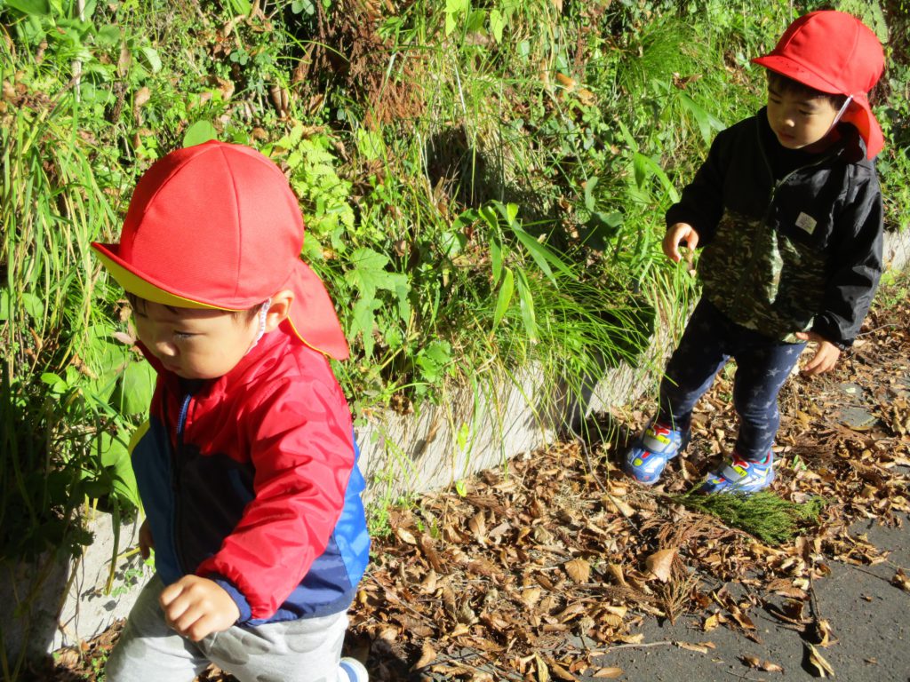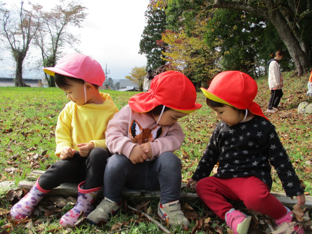 色とりどりの木の葉が落ち、園庭には赤、黄、茶、様々な色の絨毯を敷いてくれています。