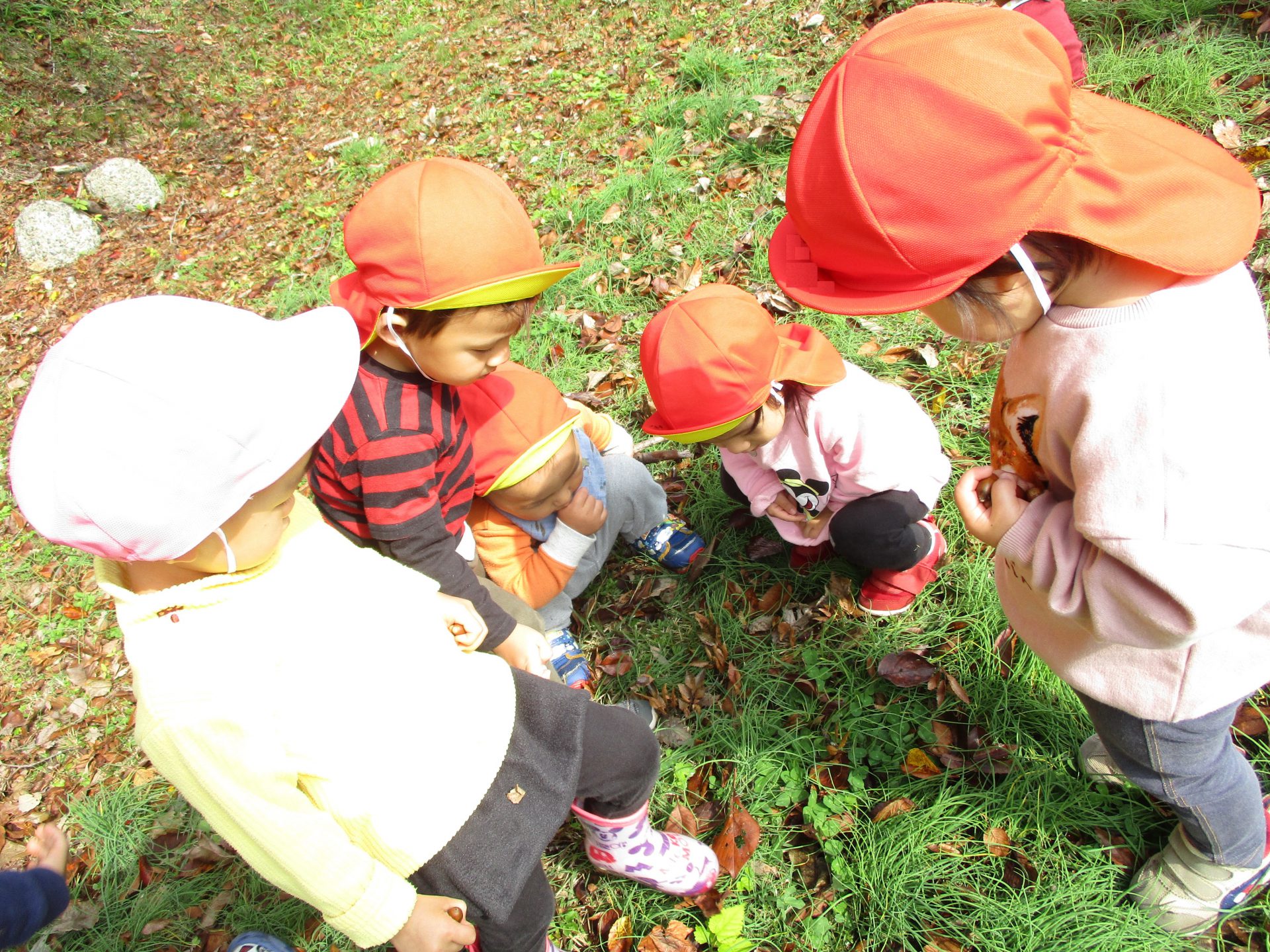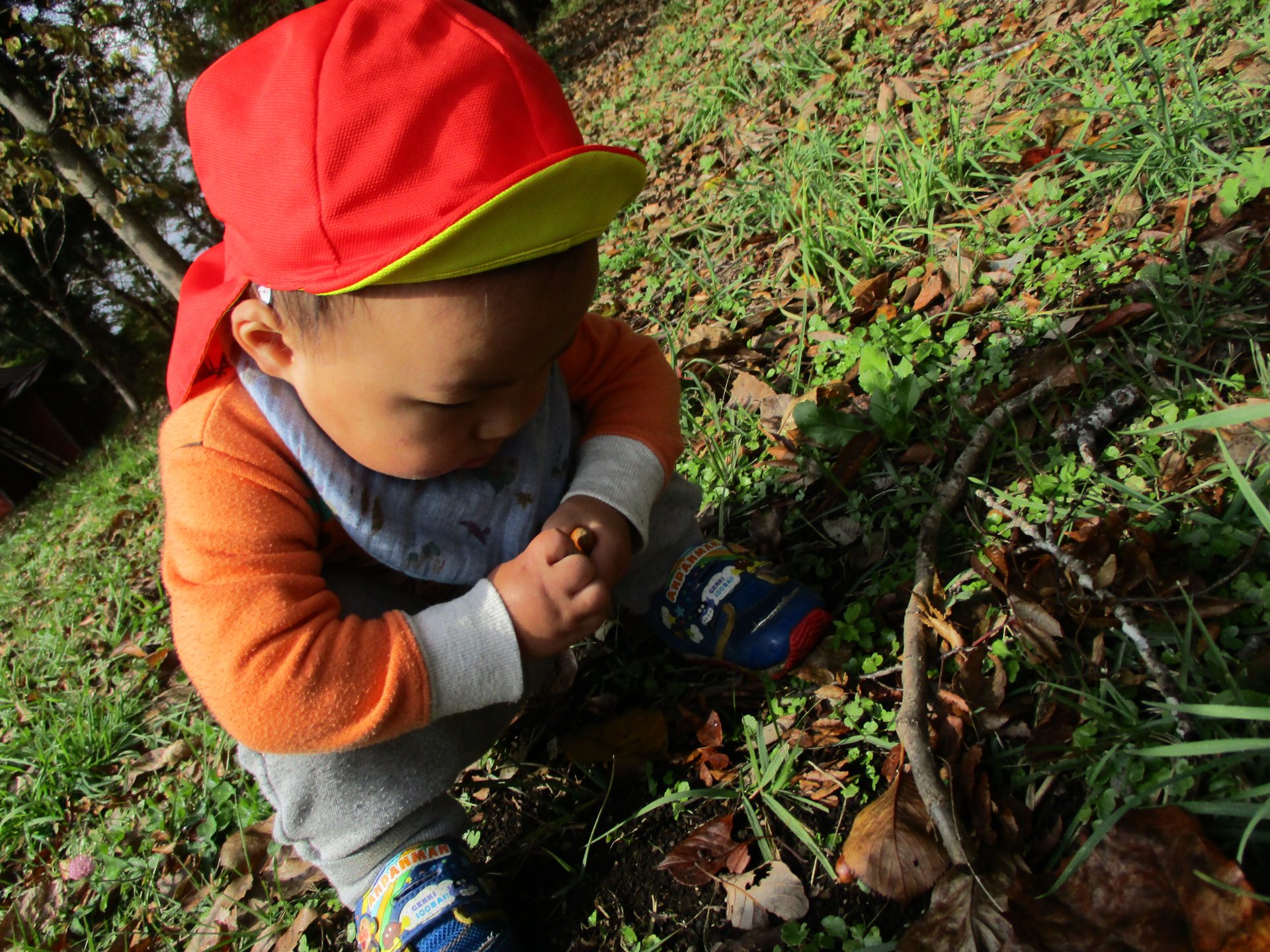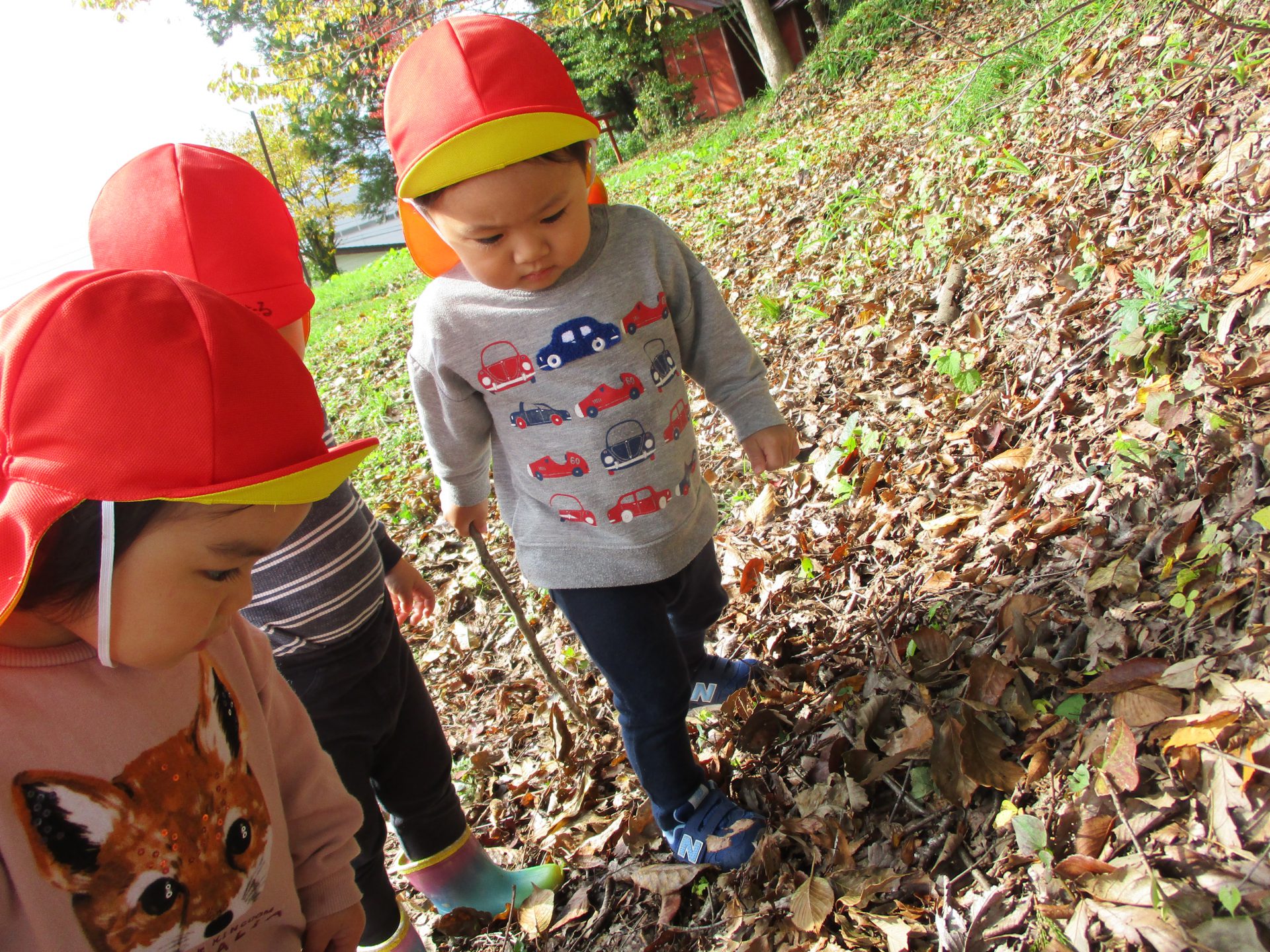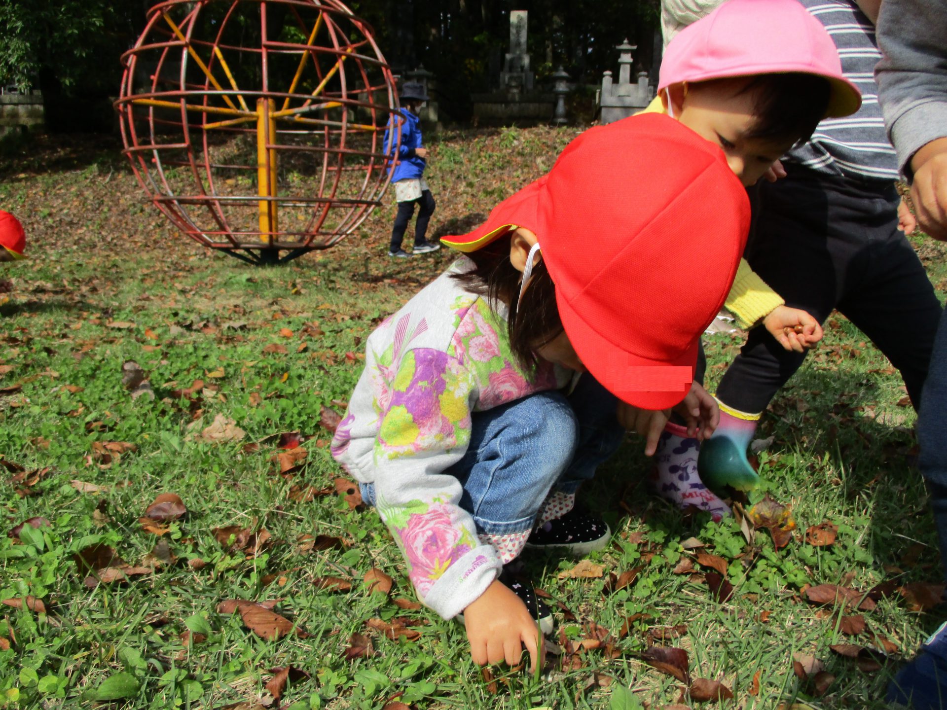 色とりどりの木の葉が落ち、園庭には赤、黄、茶、様々な色の絨毯を敷いてくれています。