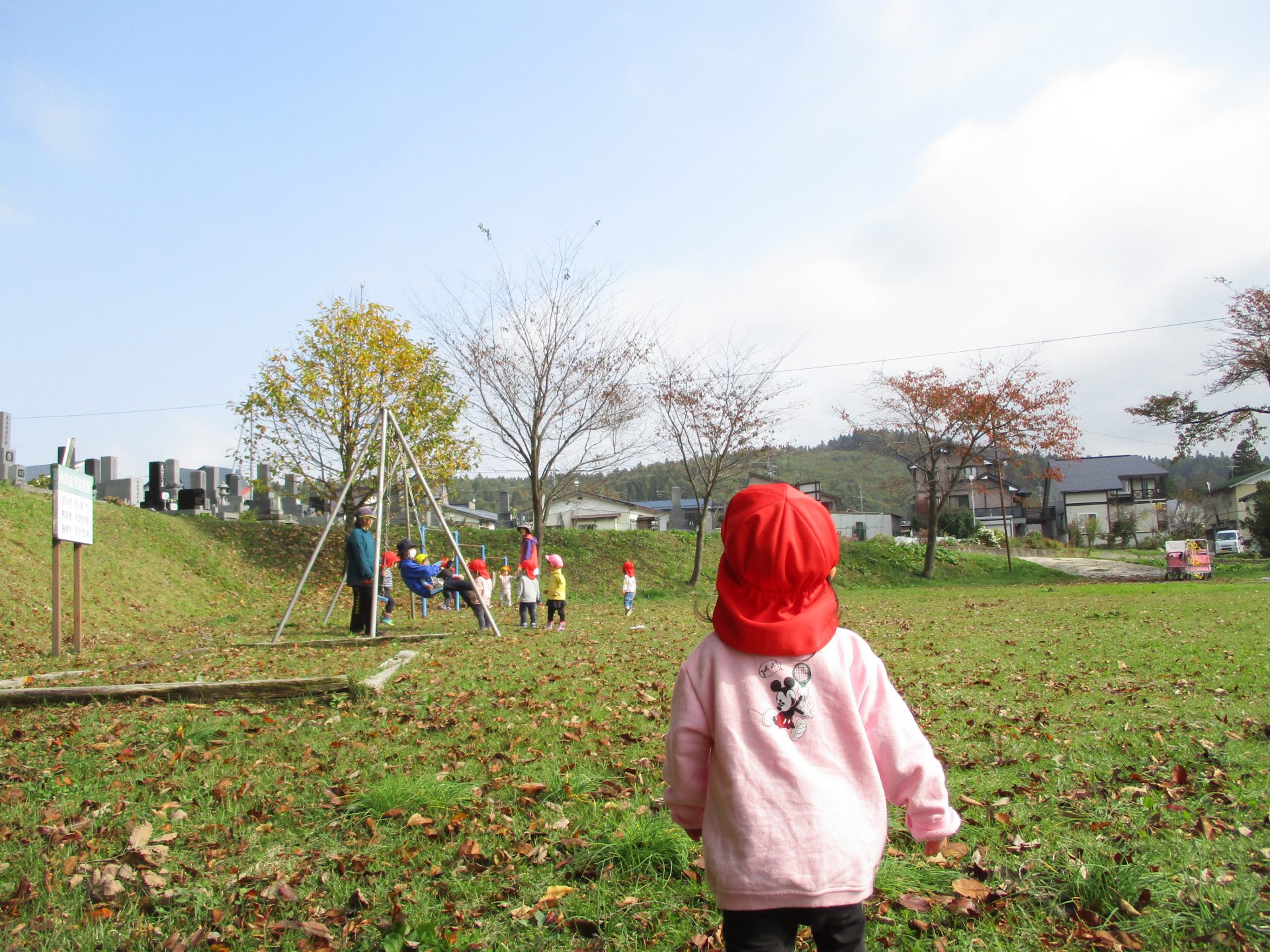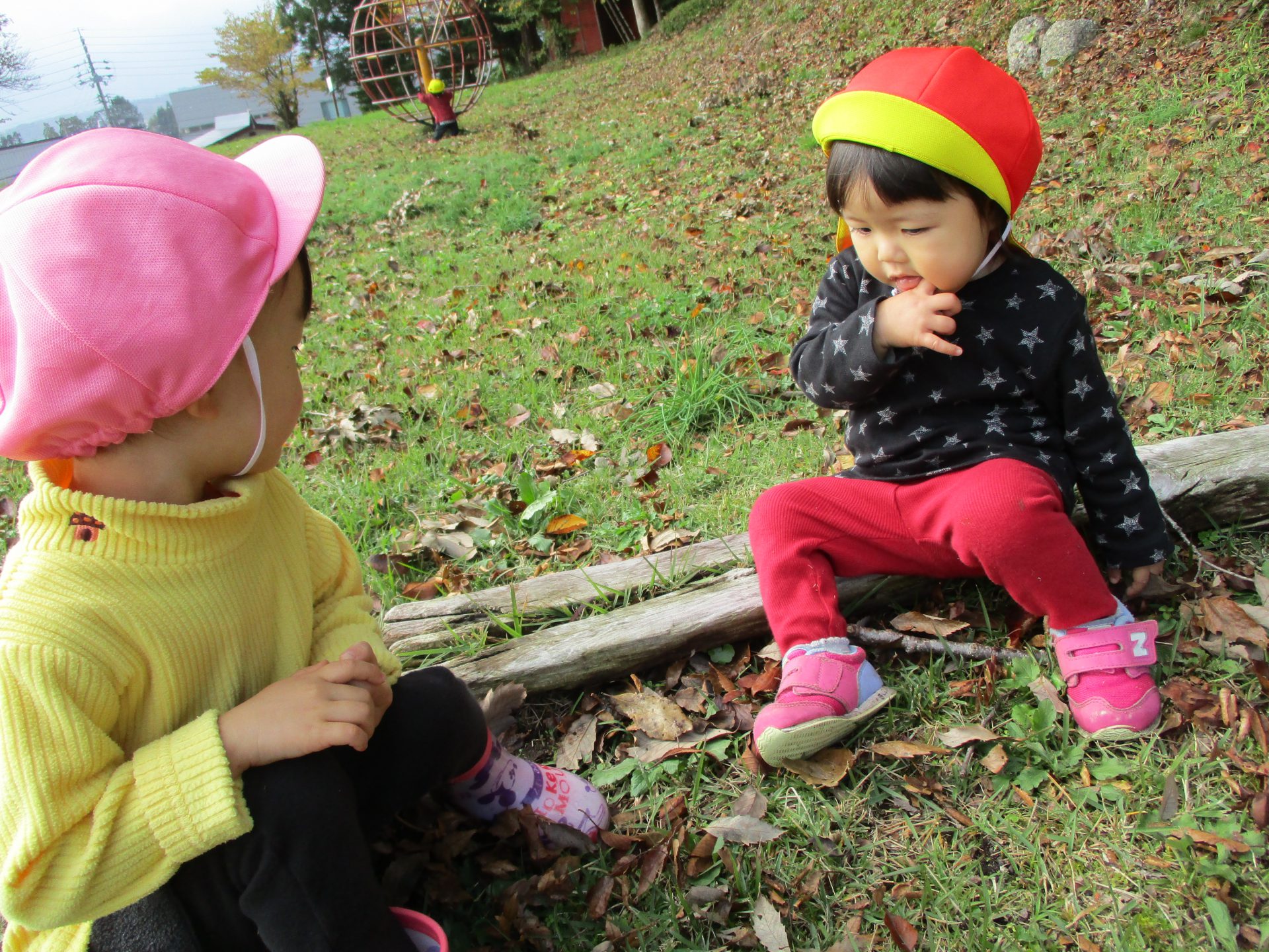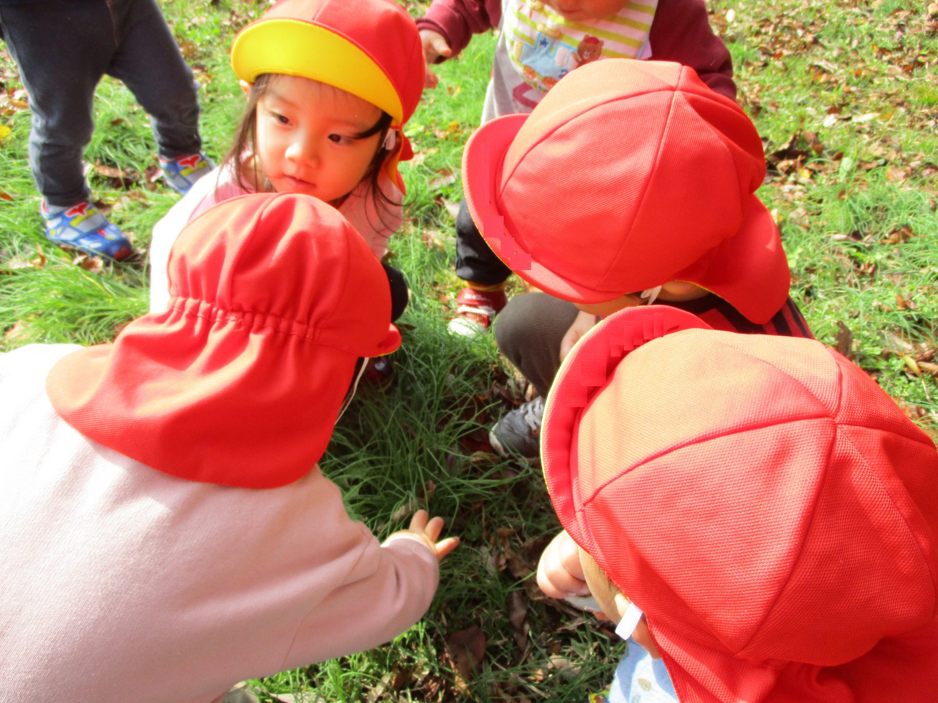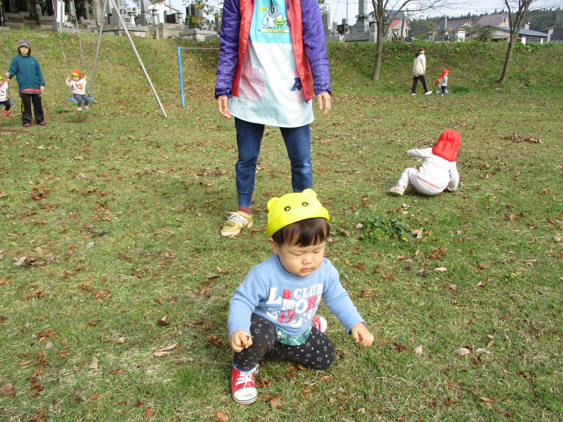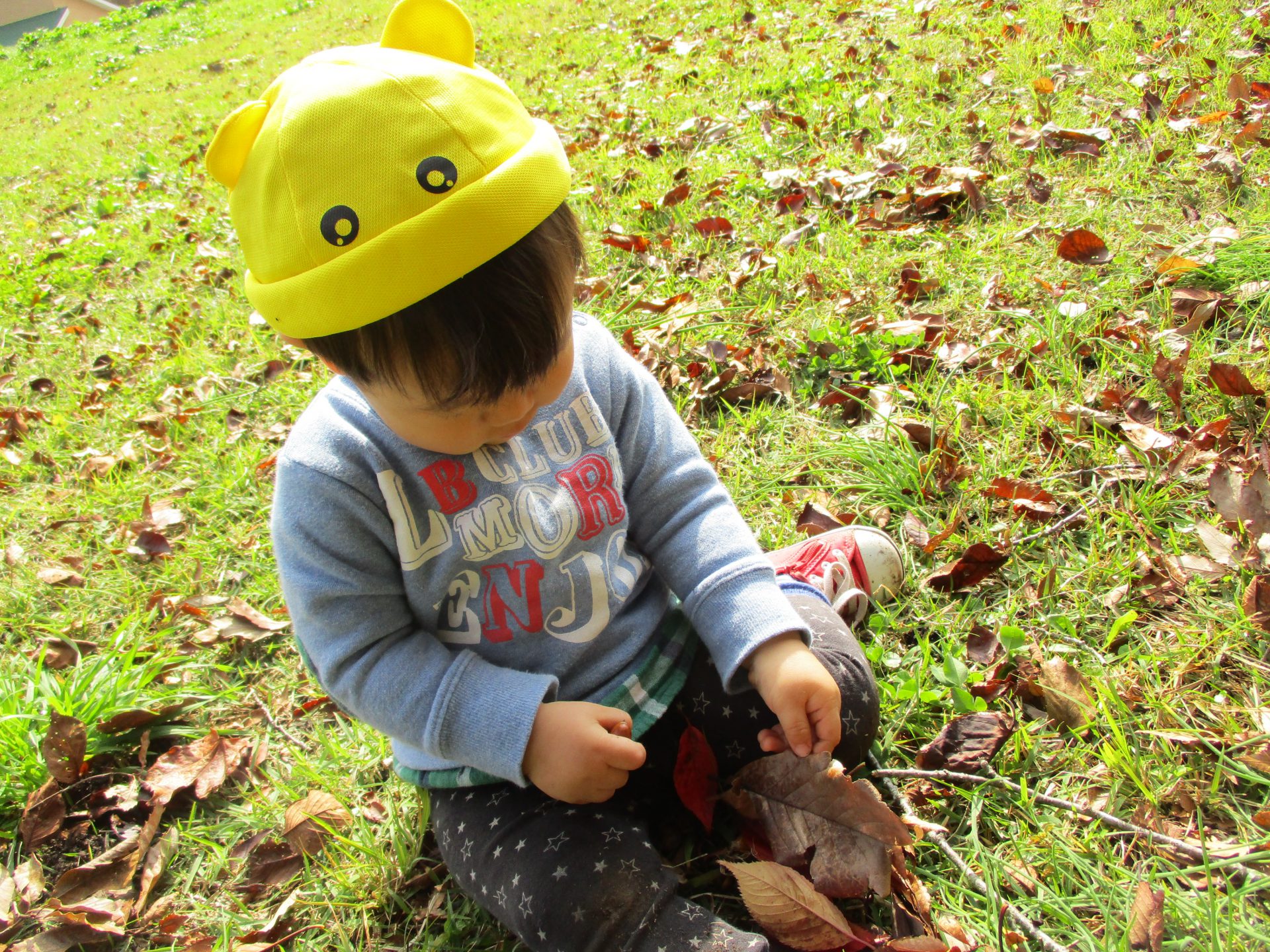 色とりどりの木の葉が落ち、園庭には赤、黄、茶、様々な色の絨毯を敷いてくれています。