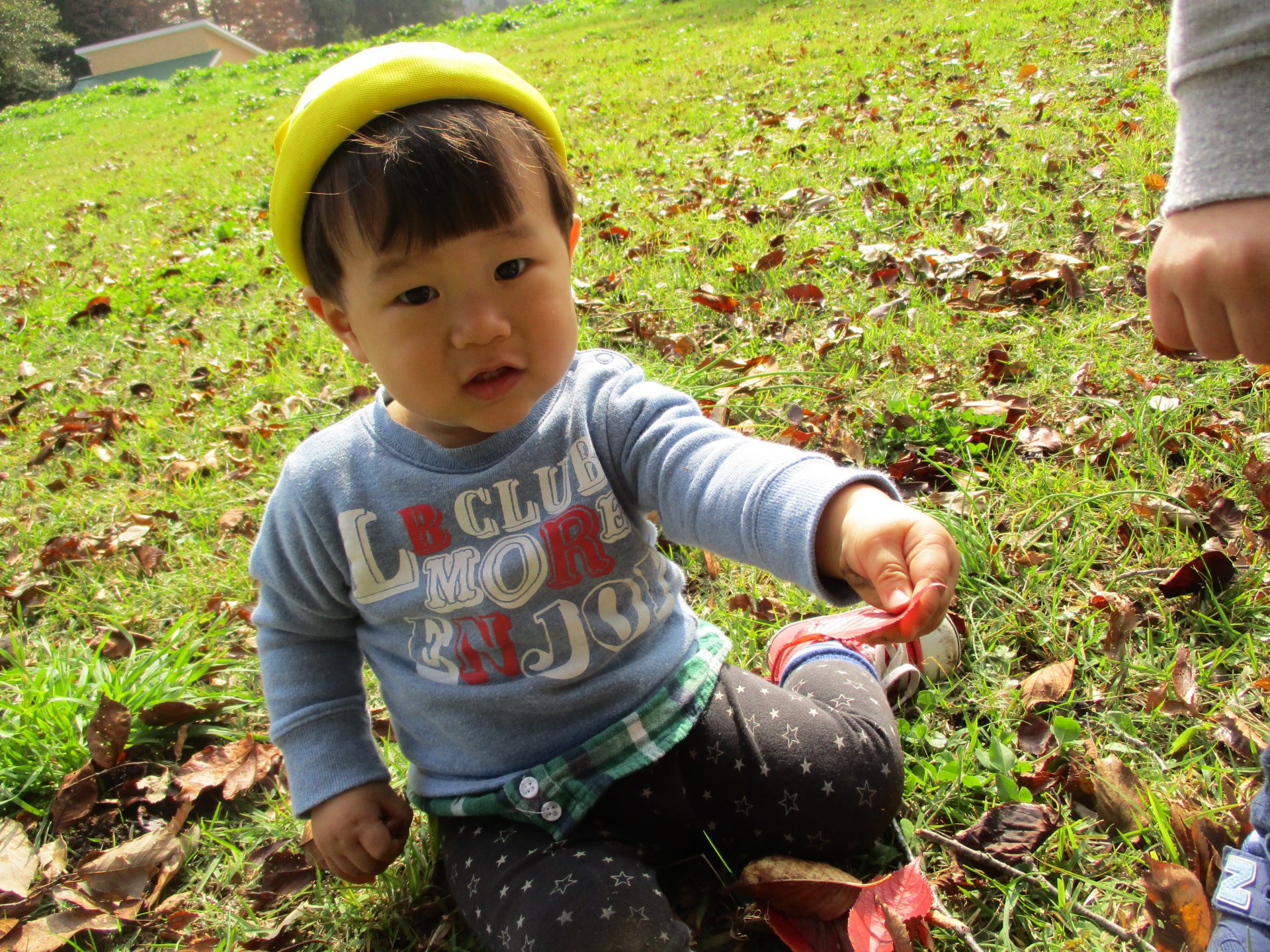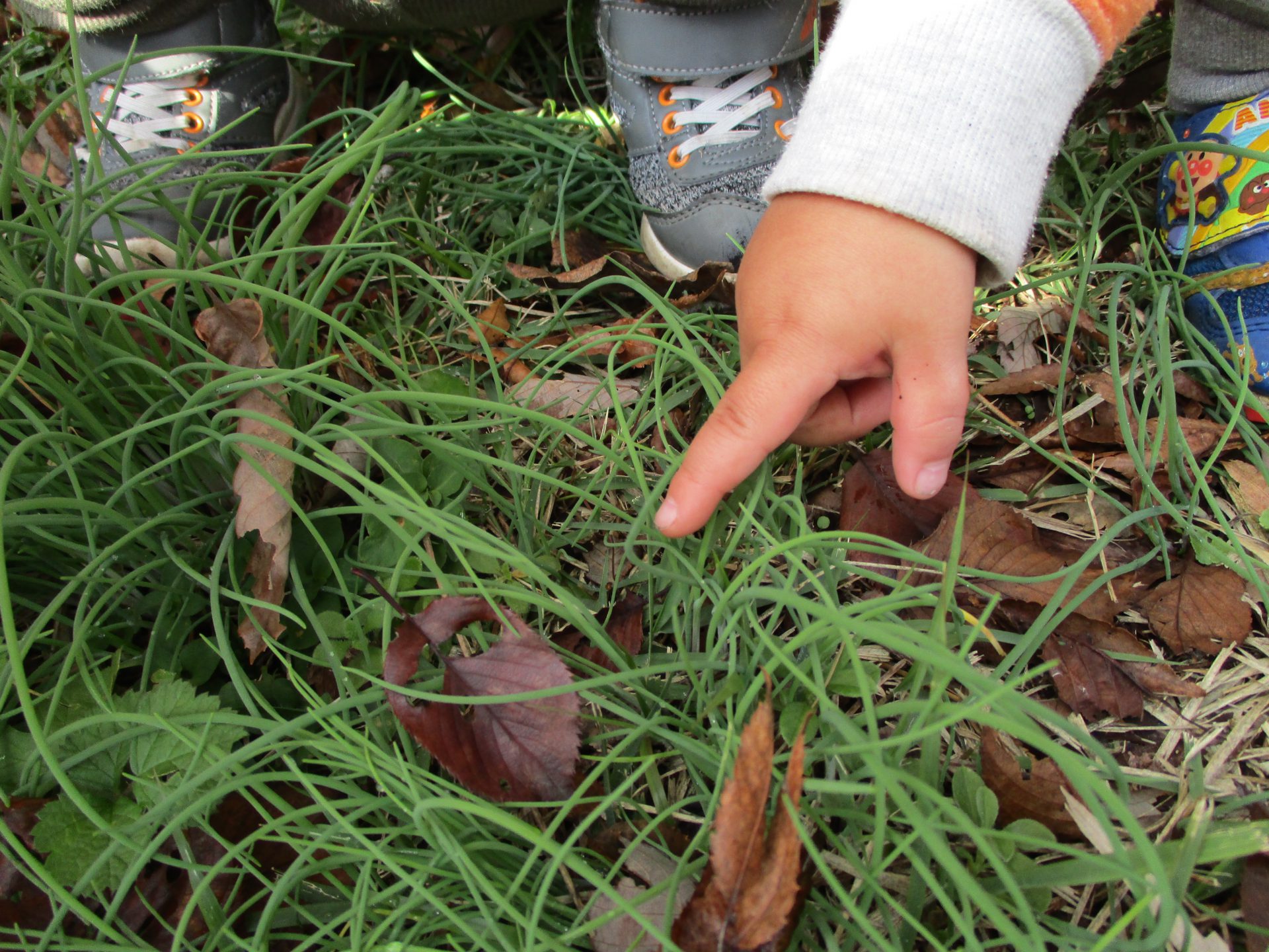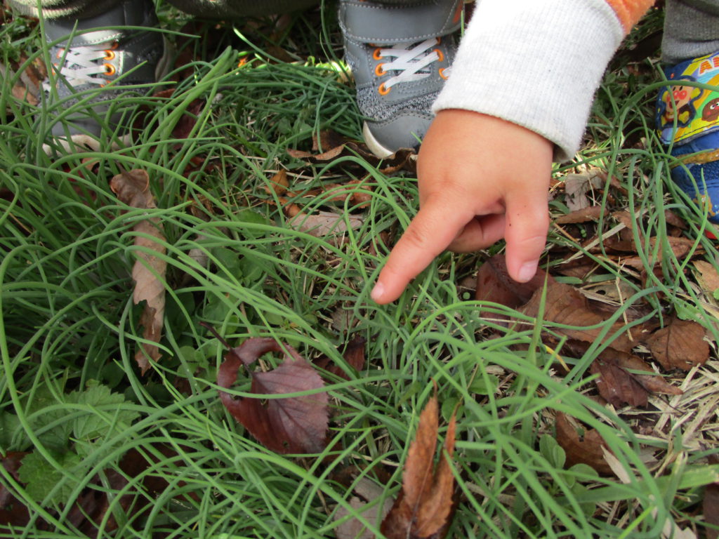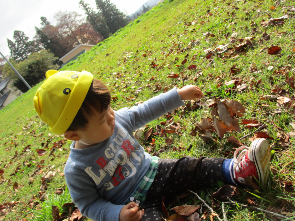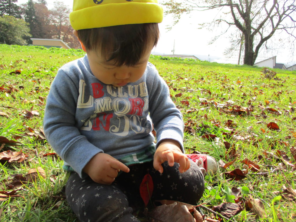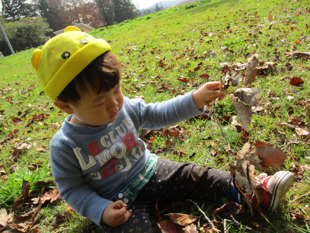 何度かこの動作を繰り返していた男の子。葉の手触り、音、重さ、いろいろなことを遊びの中で経験しているようですね。