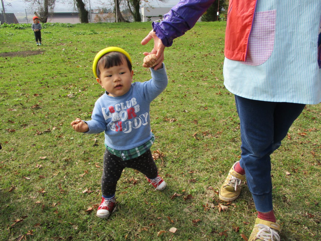 0歳児のお友だちは、広い公園でのびのびと歩くことを楽しみます。