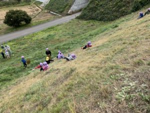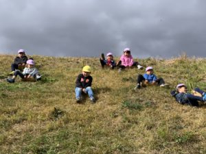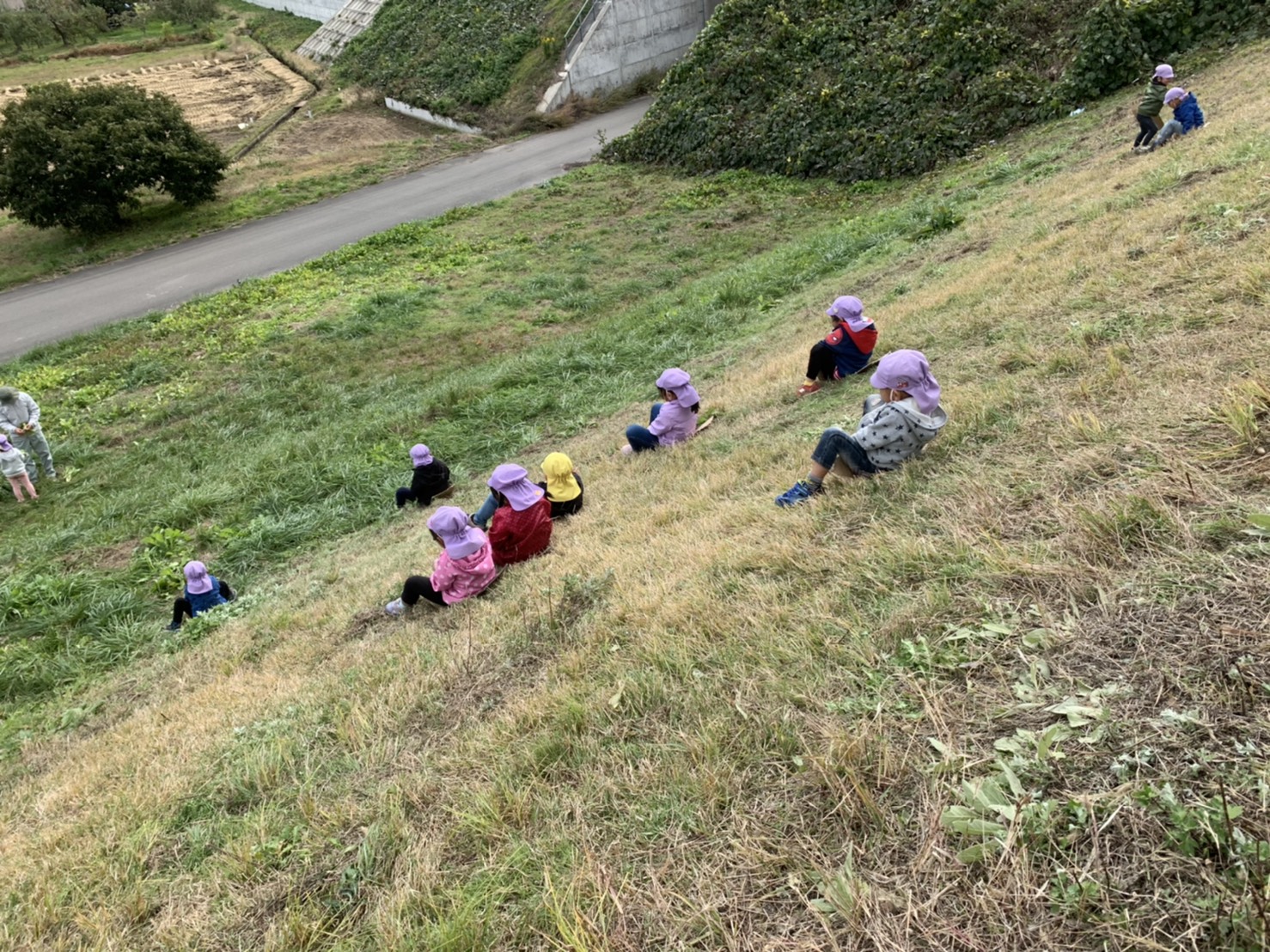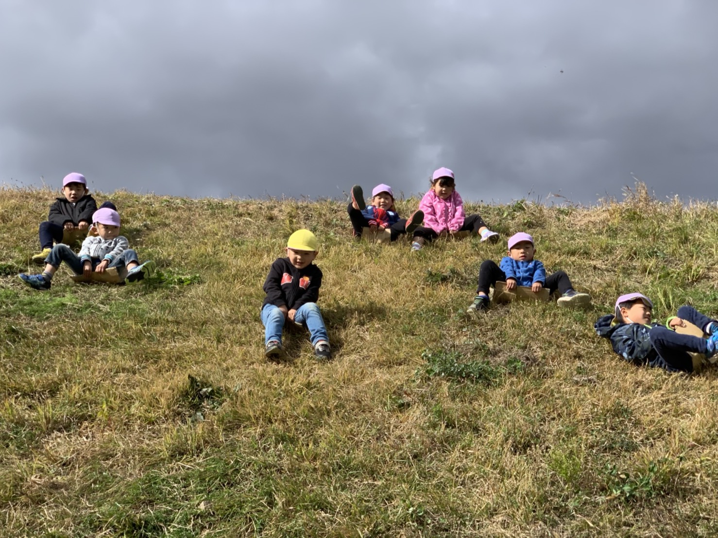 どうやってすべるんだろう?から、段ボール紙にお尻を乗せ、段ボール紙の前を手で持ちすべり始める。が、なかなか上手くすべらず…何度もすべる中でいろいろ試しながらよくすべる場所(石がないところ、緑色より茶色い(草が枯れている)場所)や体勢(足をつかない、体を後ろに傾ける)に気づき、友だち同士伝え合う姿も見られ、徐々にスピードが加速し、歓声をあげながら喜んで遊んでいた。
