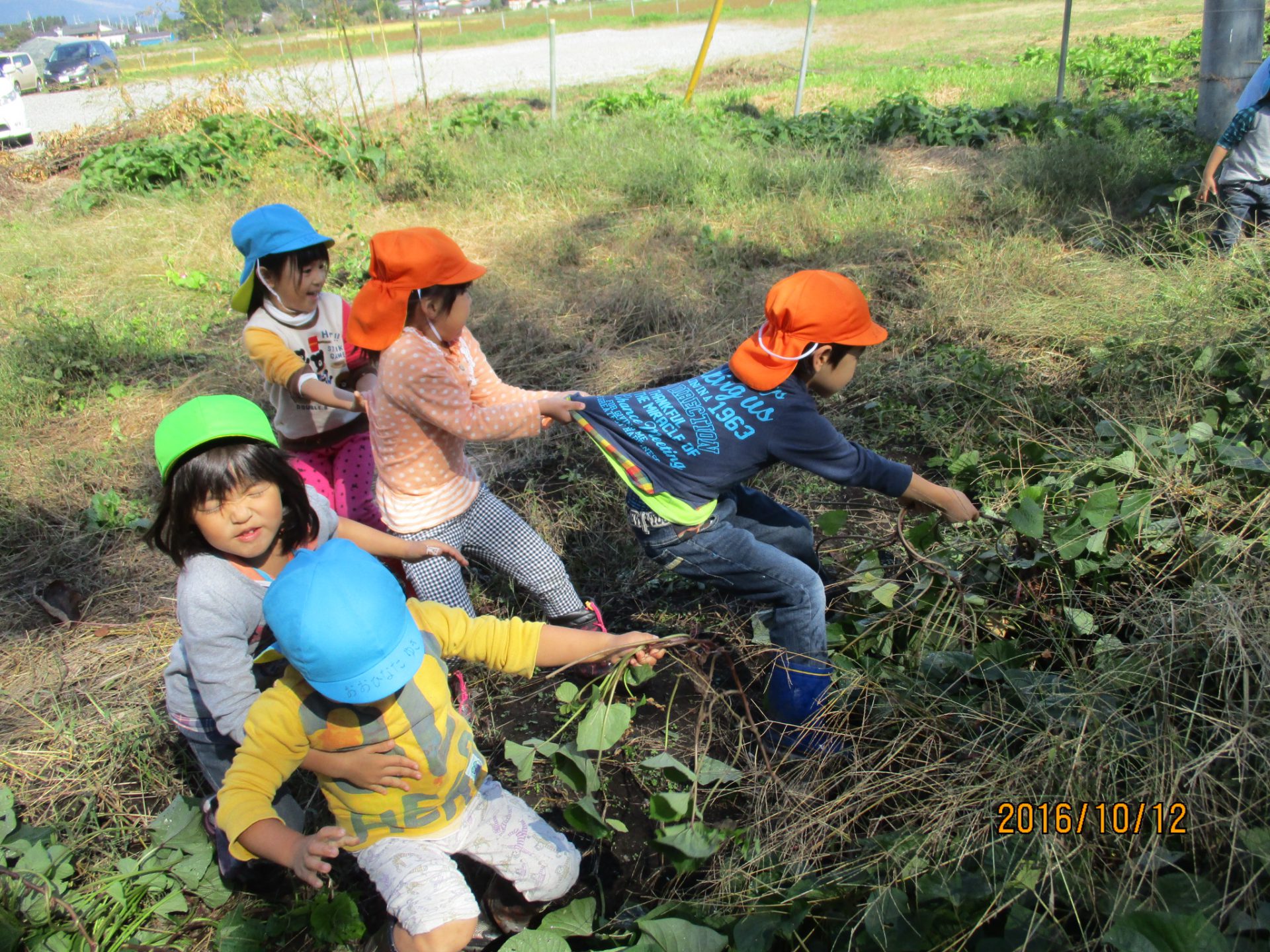 うんとこしょ!どっこいしょ!まずはつるをひっぱって取ります。「ちょっと、手伝って!」