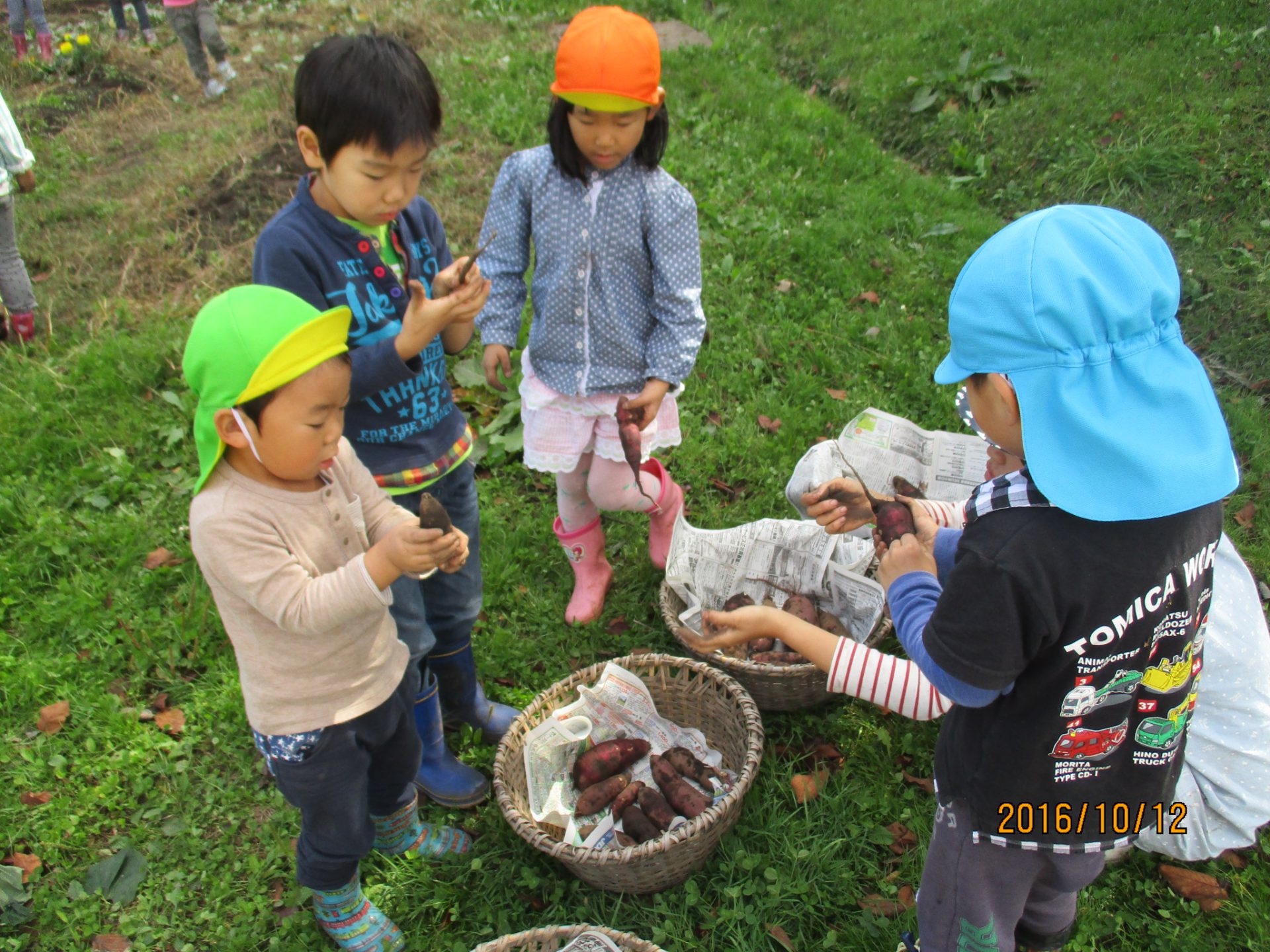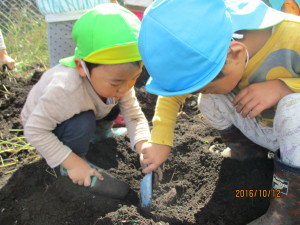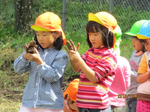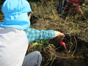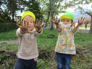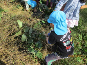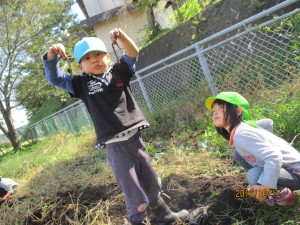 去年つるで縄跳びをしていたことを覚えていた子は、長いつるを探していましたが今年は短くて一回跳ぶのがやっと…。でも皆で掘るとざるひと山になりました。掘り終わってからも畑で土に触れ、楽しんでいる子もいました。自分達で育てたさつまいもで焼いも大会。さつまいもを眺めながら待つ時間も楽しみたいと思います。