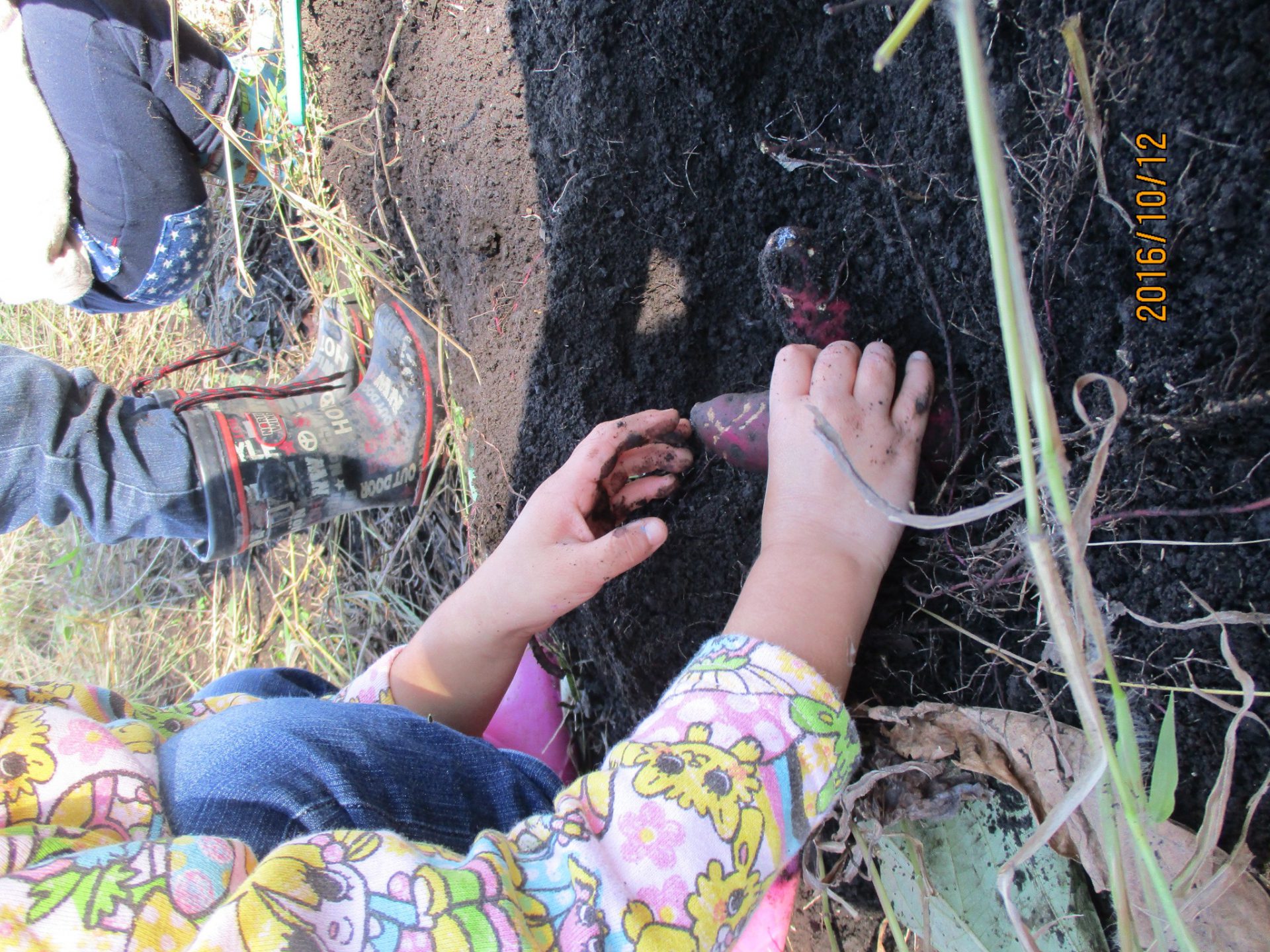 ここに根っこがあるってことはこの辺にあるんだよ!赤紫の根っこをたどって掘ったり。