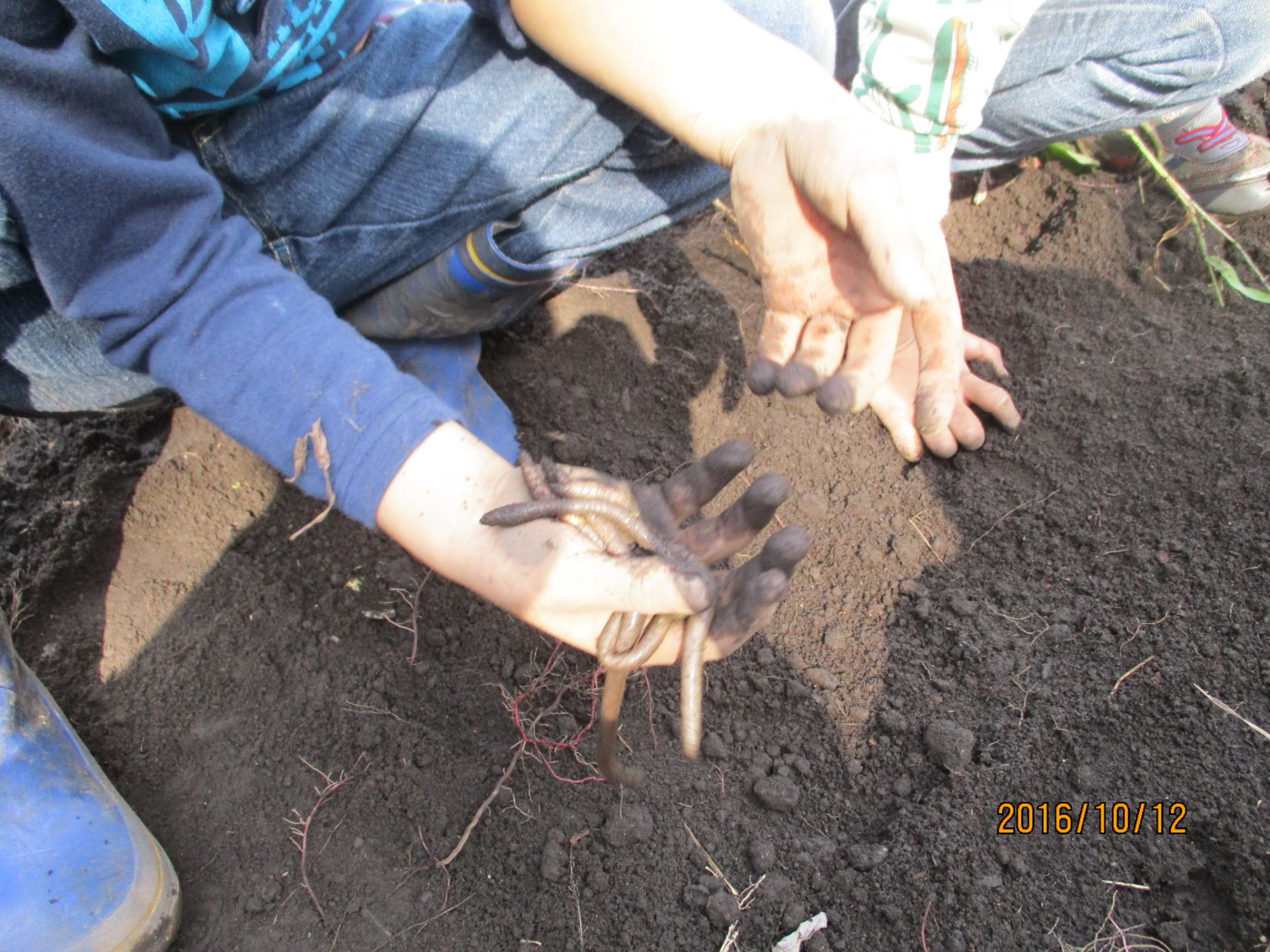 途中でみみずを発見!しかも巨大みみず!「さくらとリリーとじいちゃんとだんご!(ダンゴ虫のだんごかな?)」名前も付けていました。幼虫もたくさん出てきて、カップに捕まえたい3歳児に、幼虫博士の4歳児が見つけてあげる姿もありました。