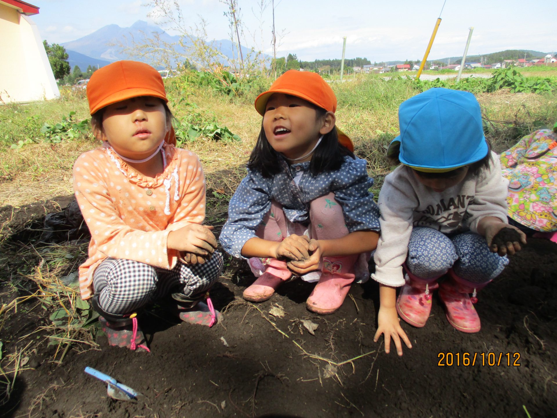 いもほりしたら、手が真っ黒!「先生!手が焦げちゃった!まるこげだー!」