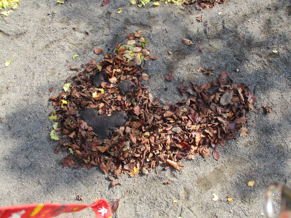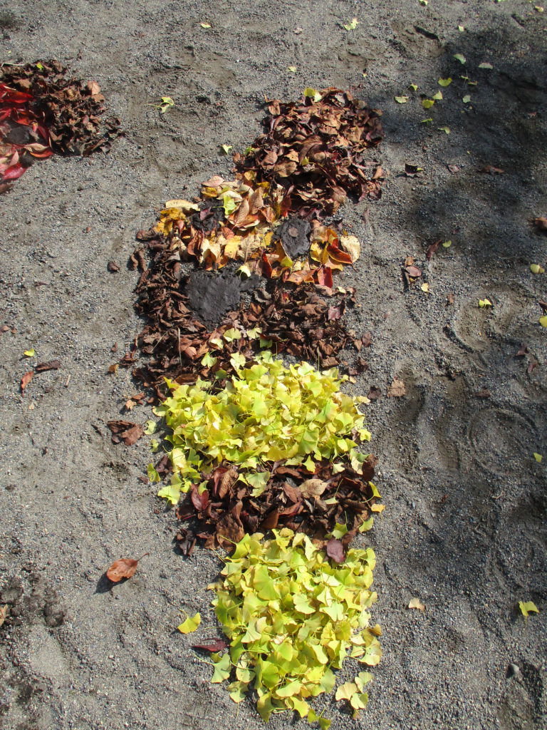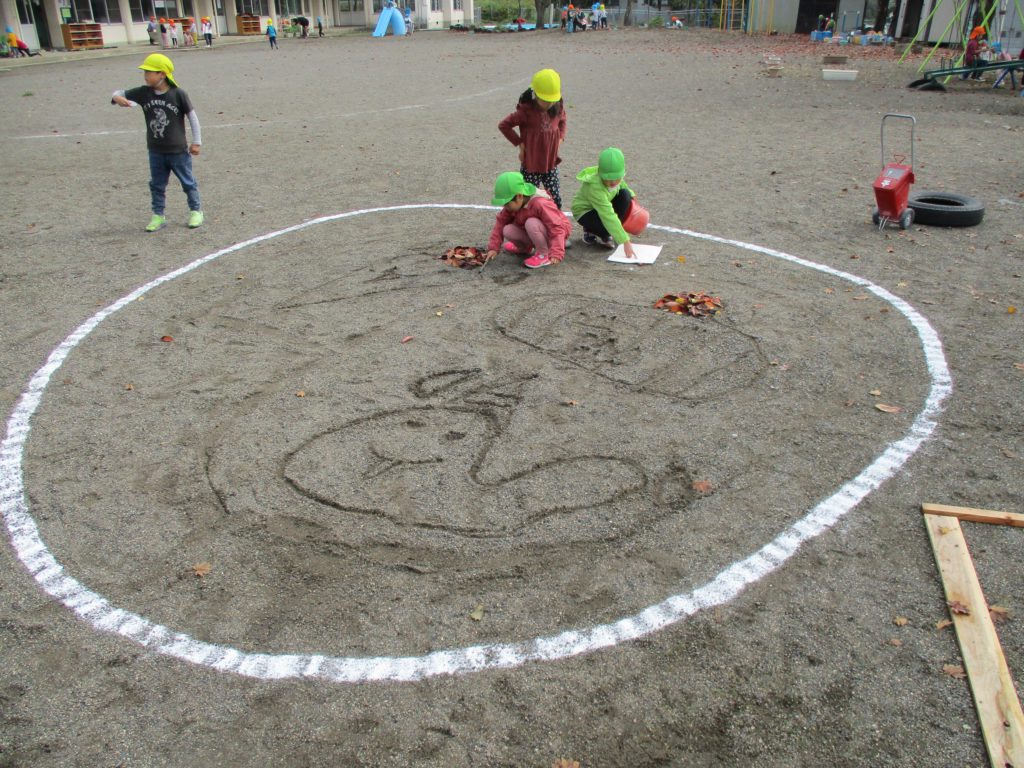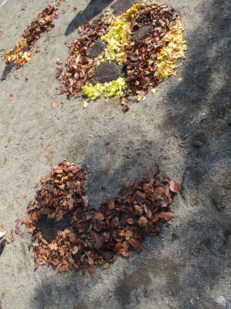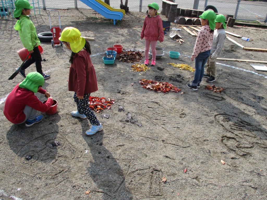「赤い葉っぱを集めよう!」「次は黄色がいいかなぁ?」と土に描いたおばけがだんだん色づいてきています。