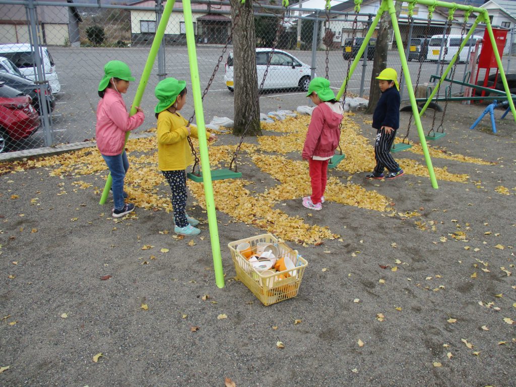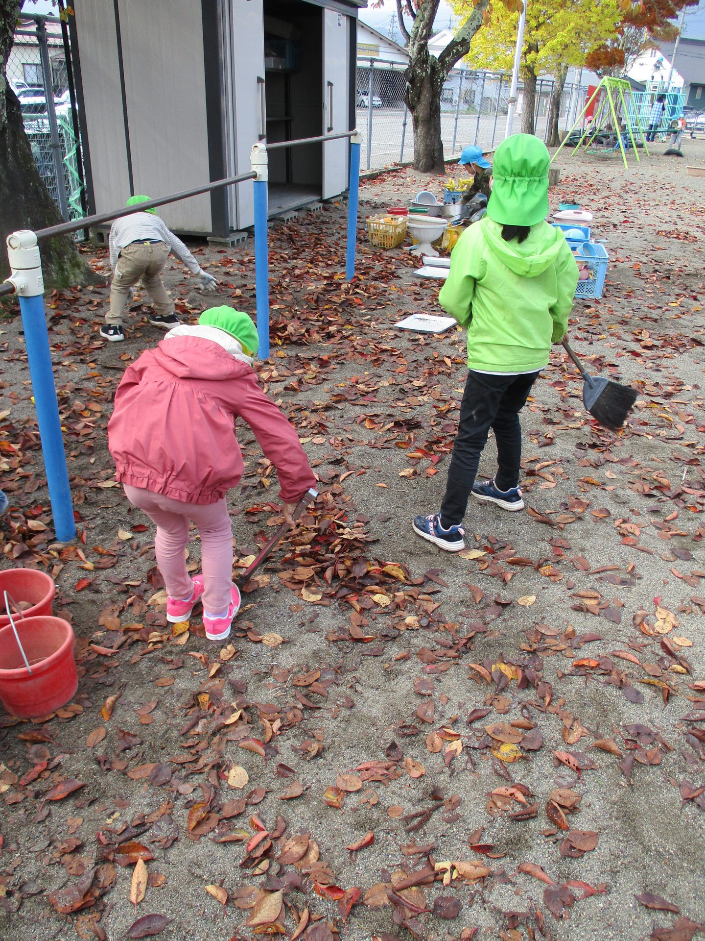保育園の園庭には桜の木がたくさん。春にはきれいなピンク色の桜が咲き、夏には子ども達の憩いの場となる大きな日陰を作ってくれる桜の木。そして赤やオレンジ色に色づき、今は下に落ち葉の絨毯ができています。