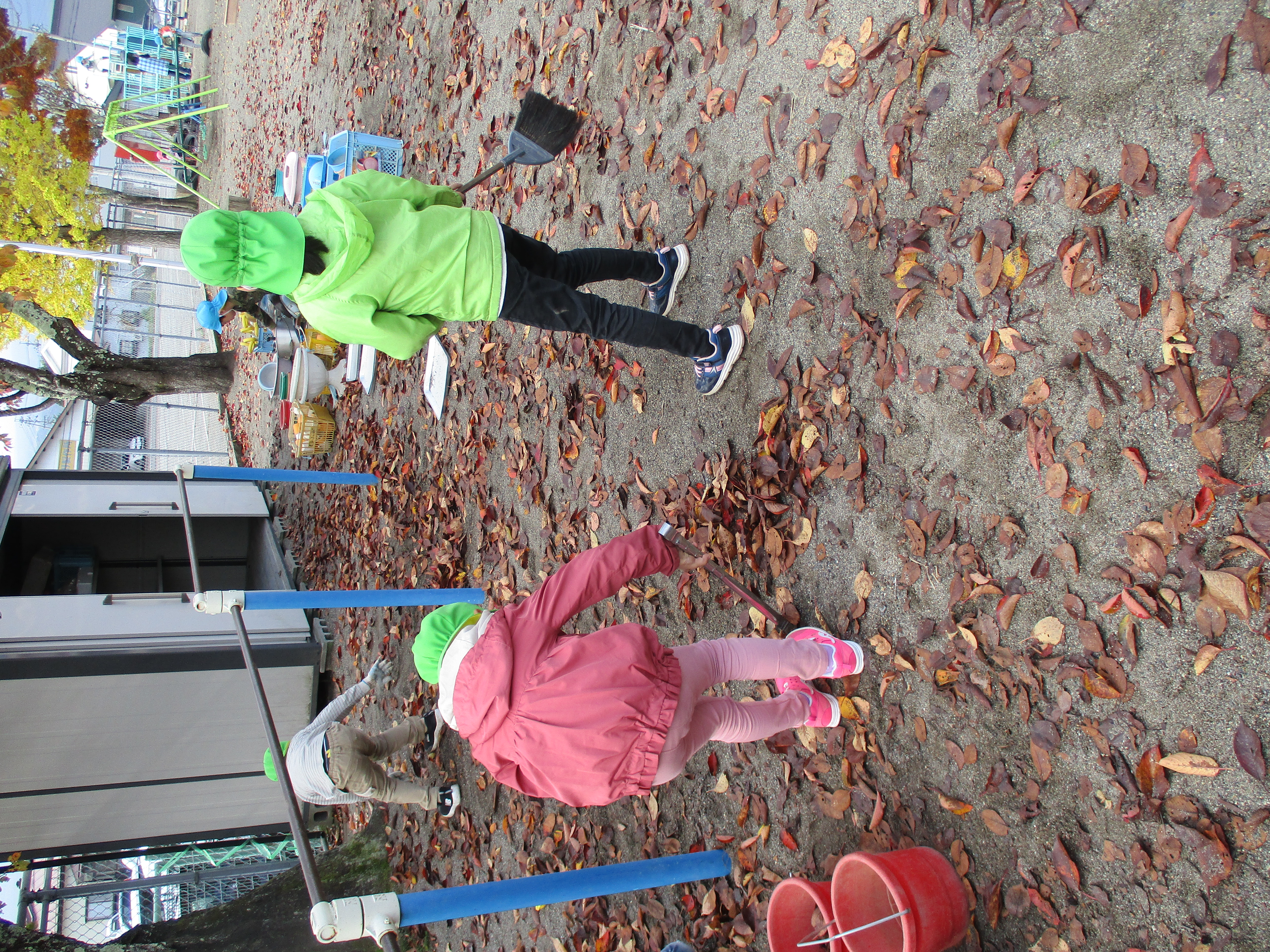 「ほうき持ってくる!」と。落ち葉をほうきではいて集めています。