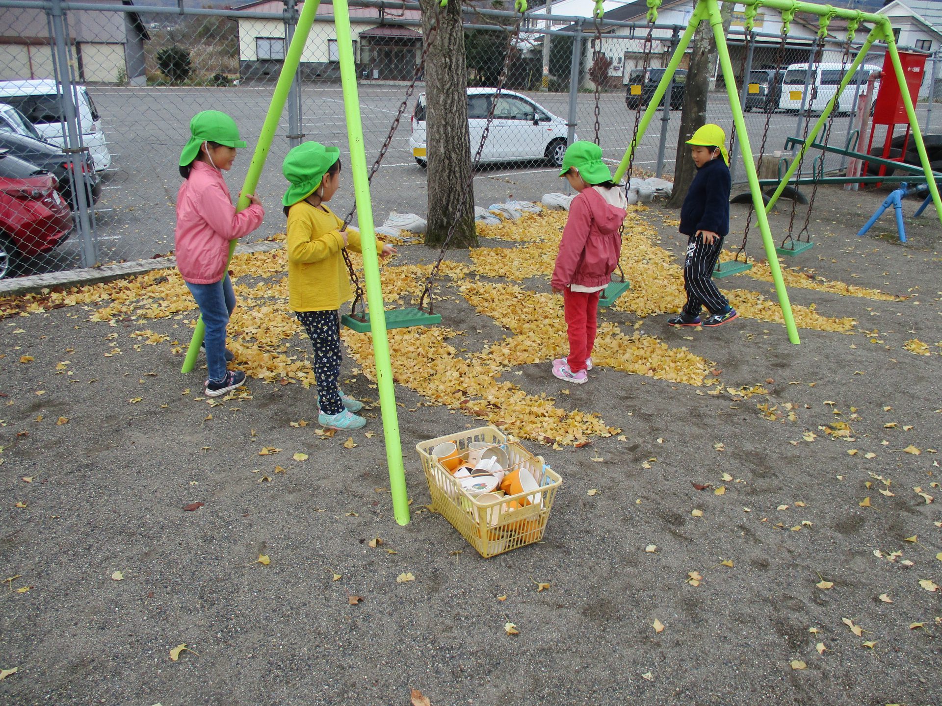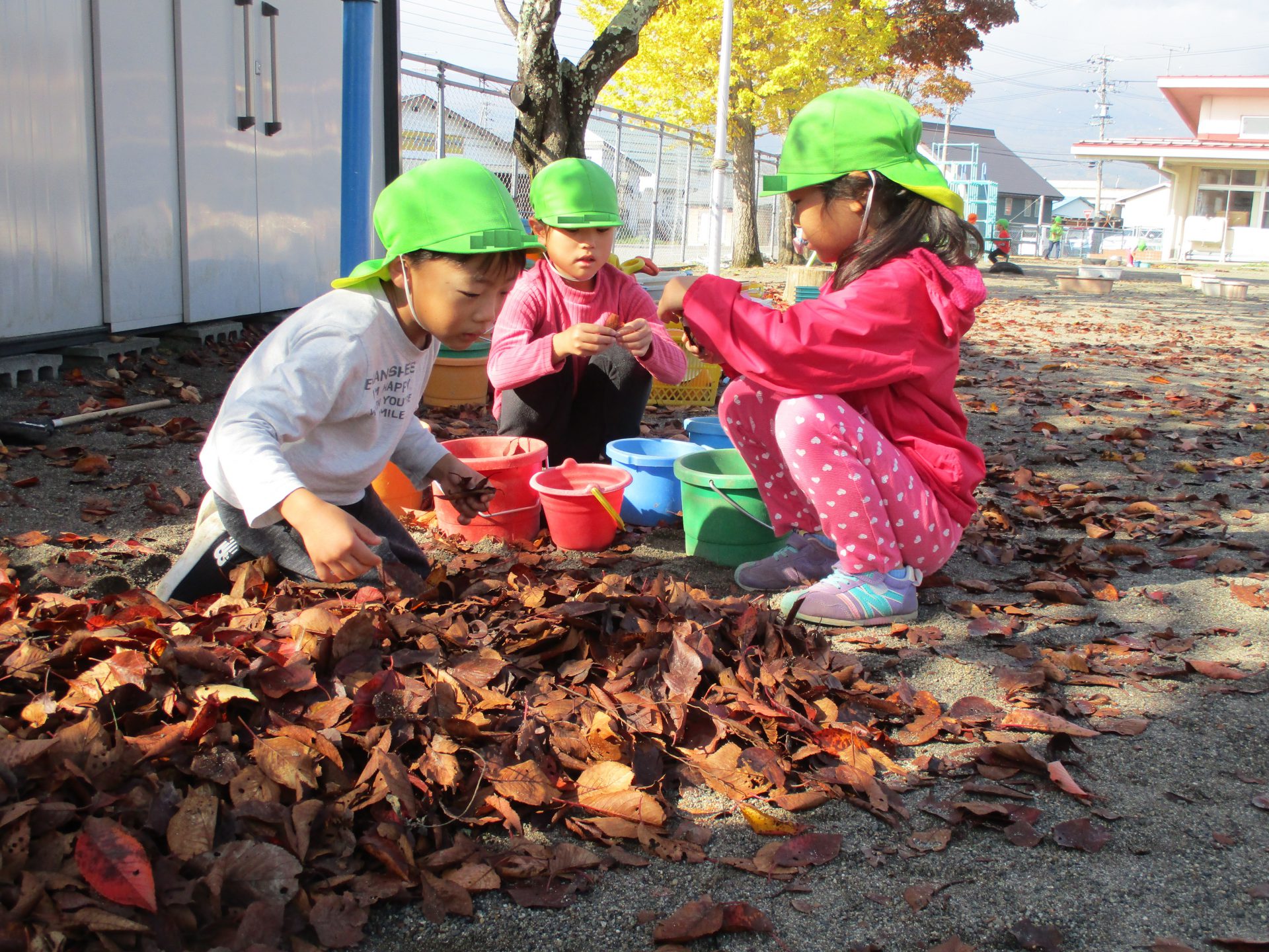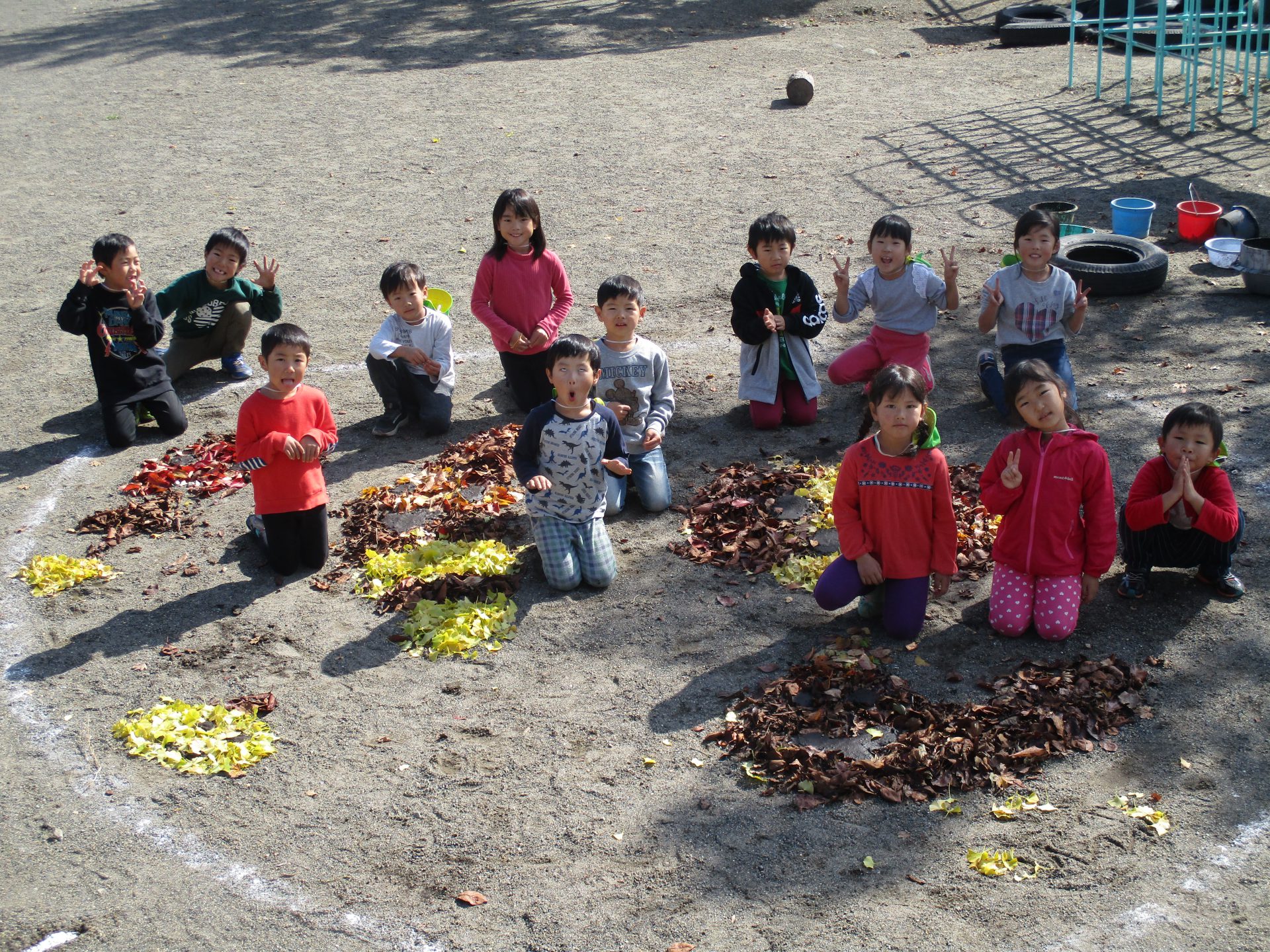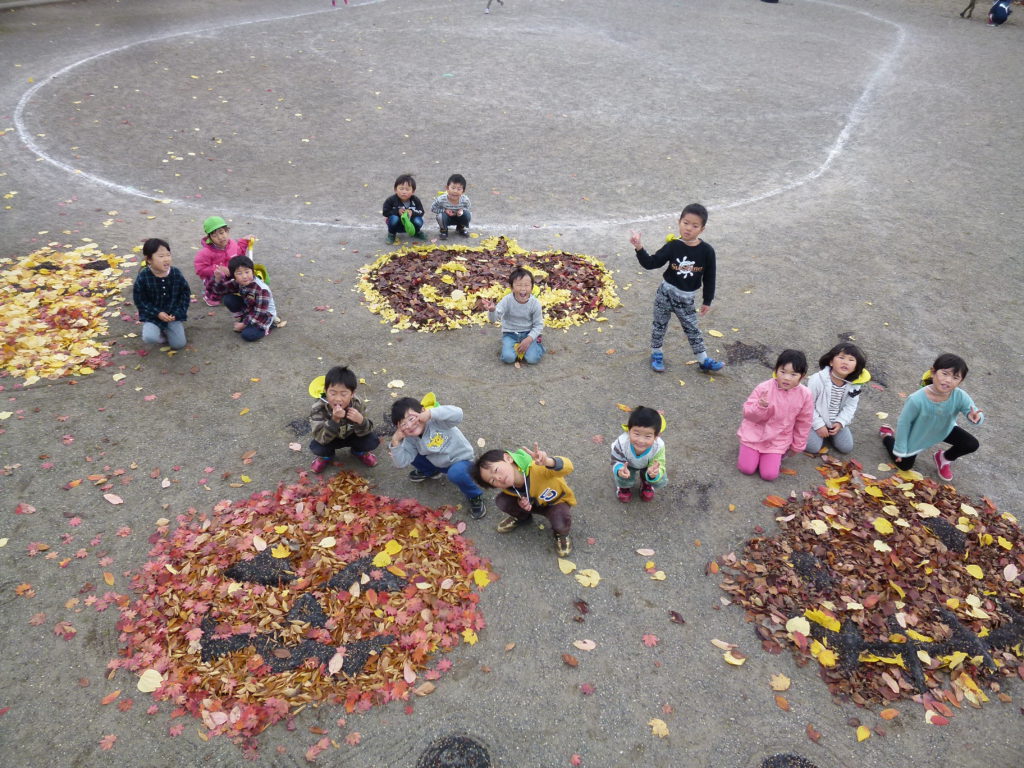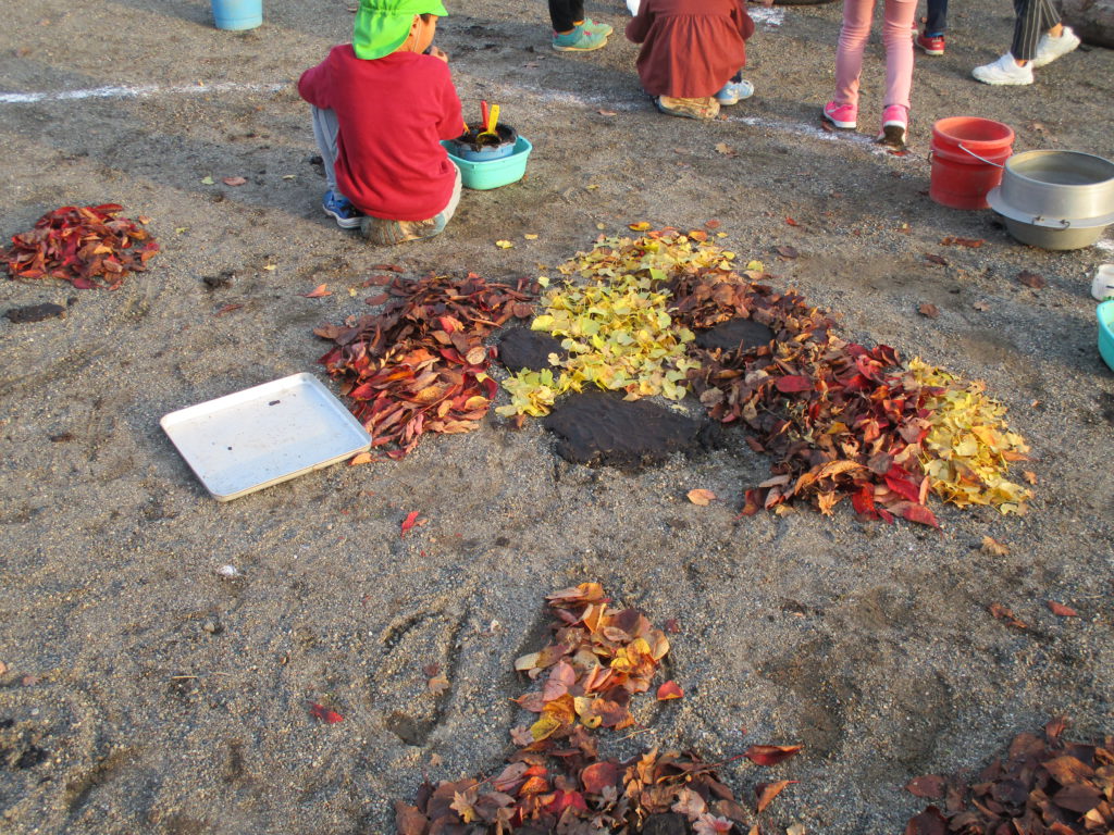 園庭に出てじーっと作ってくれたおばけを見ている子もいたんです。その2年の経験が子ども達にはずっと残っていて今回の遊びに発展しました。紅葉した木々を「きれいだなー」と思っているうちに、あっと言う間に散ってしまい、「冬がくる!」と大人はなんだか季節が移りゆく様子をただただ見ているだけですが、子ども達は「秋っていいものたくさんあるよね!だって、栗拾いしたり、焼き芋会、落ち葉を使って絵を作ったり。美味しいものと、楽しいことがたくさんあるんだもん!」と、子ども達が五感を使って秋を満喫しているようでした。