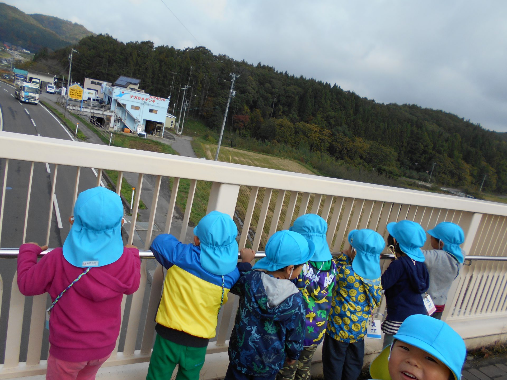 初めての歩道橋には大興奮でした。(「おーい」と手を振ると車の運転手さんが振り返してくれました。嬉しいね。)