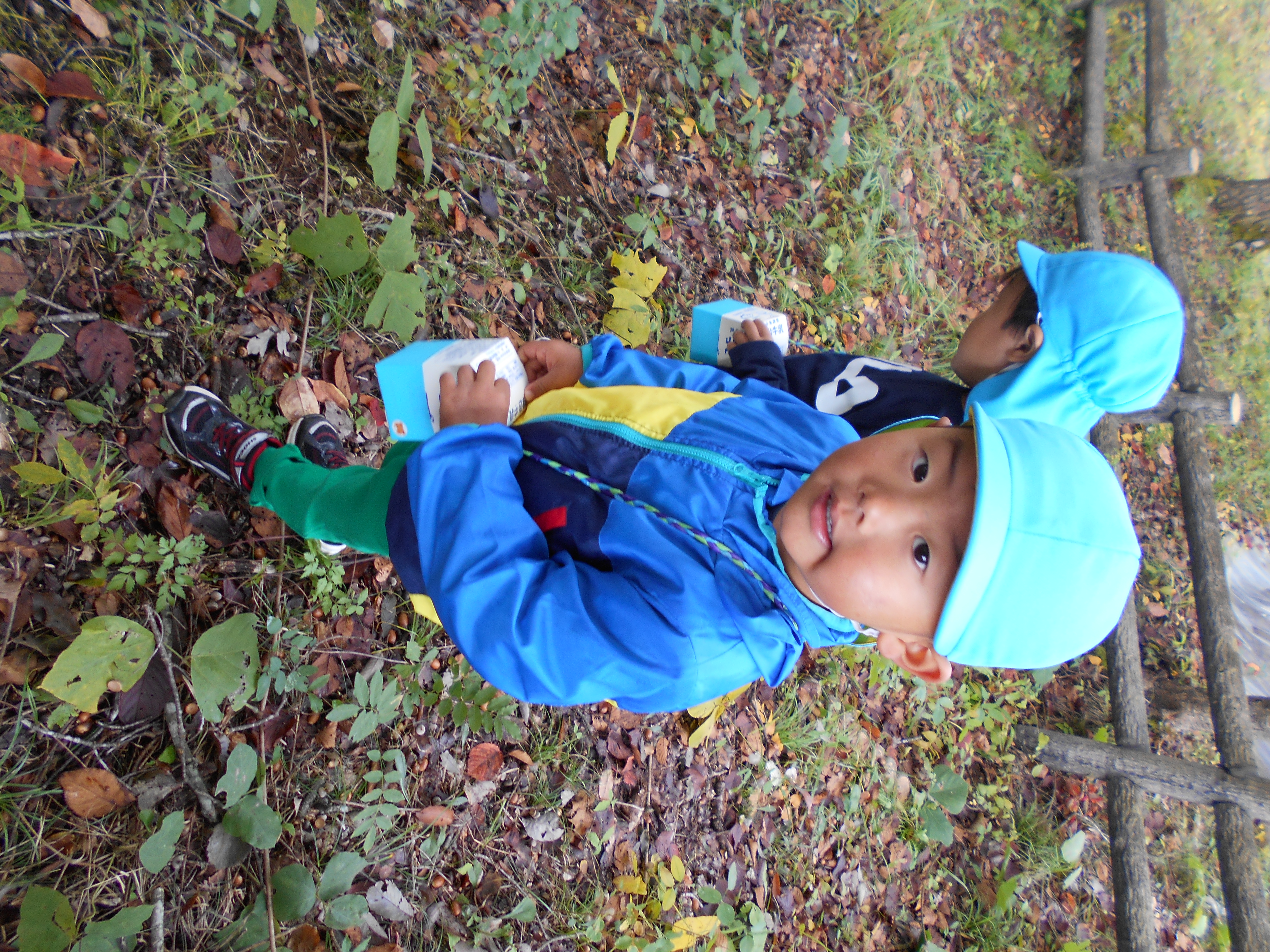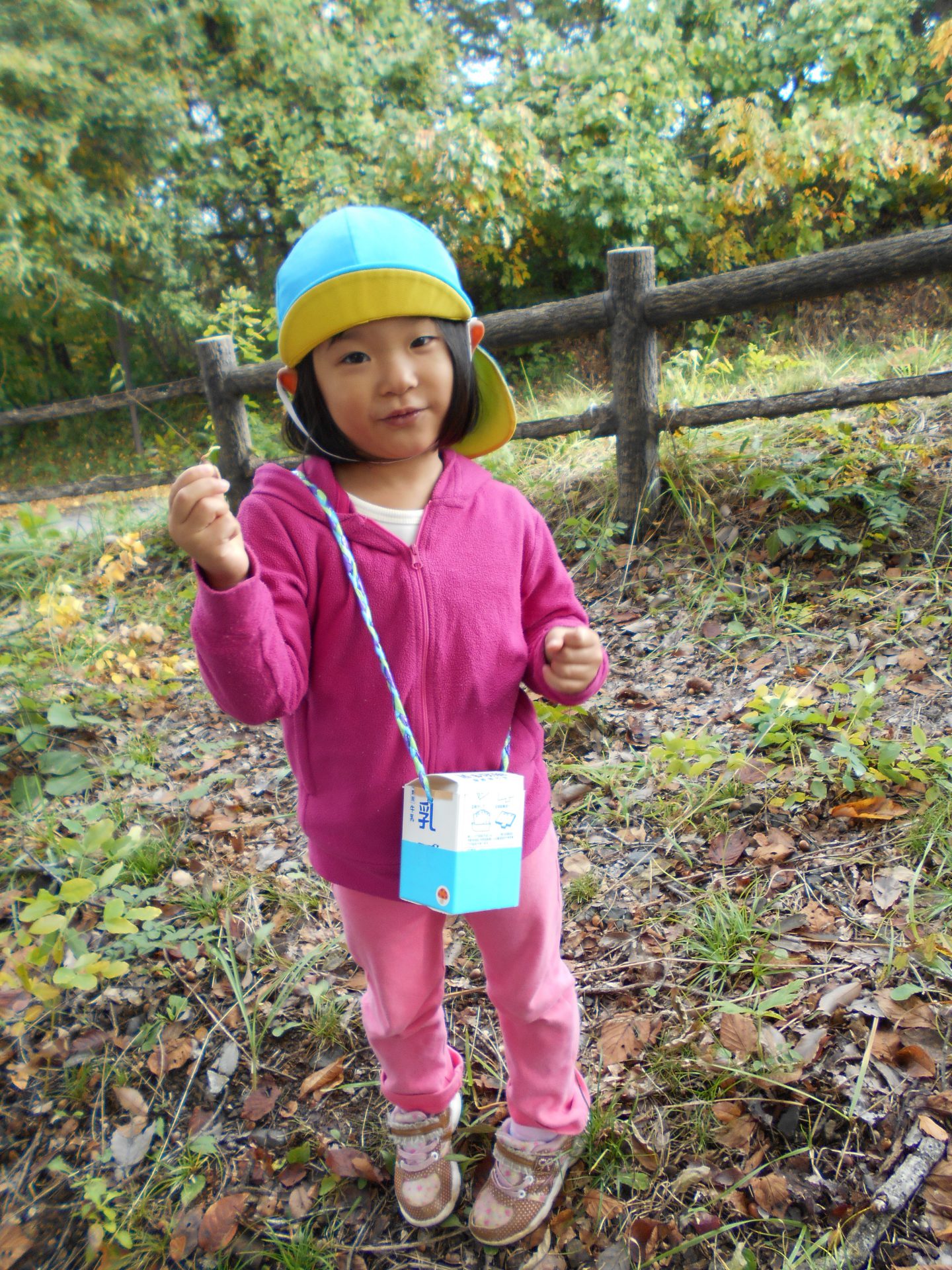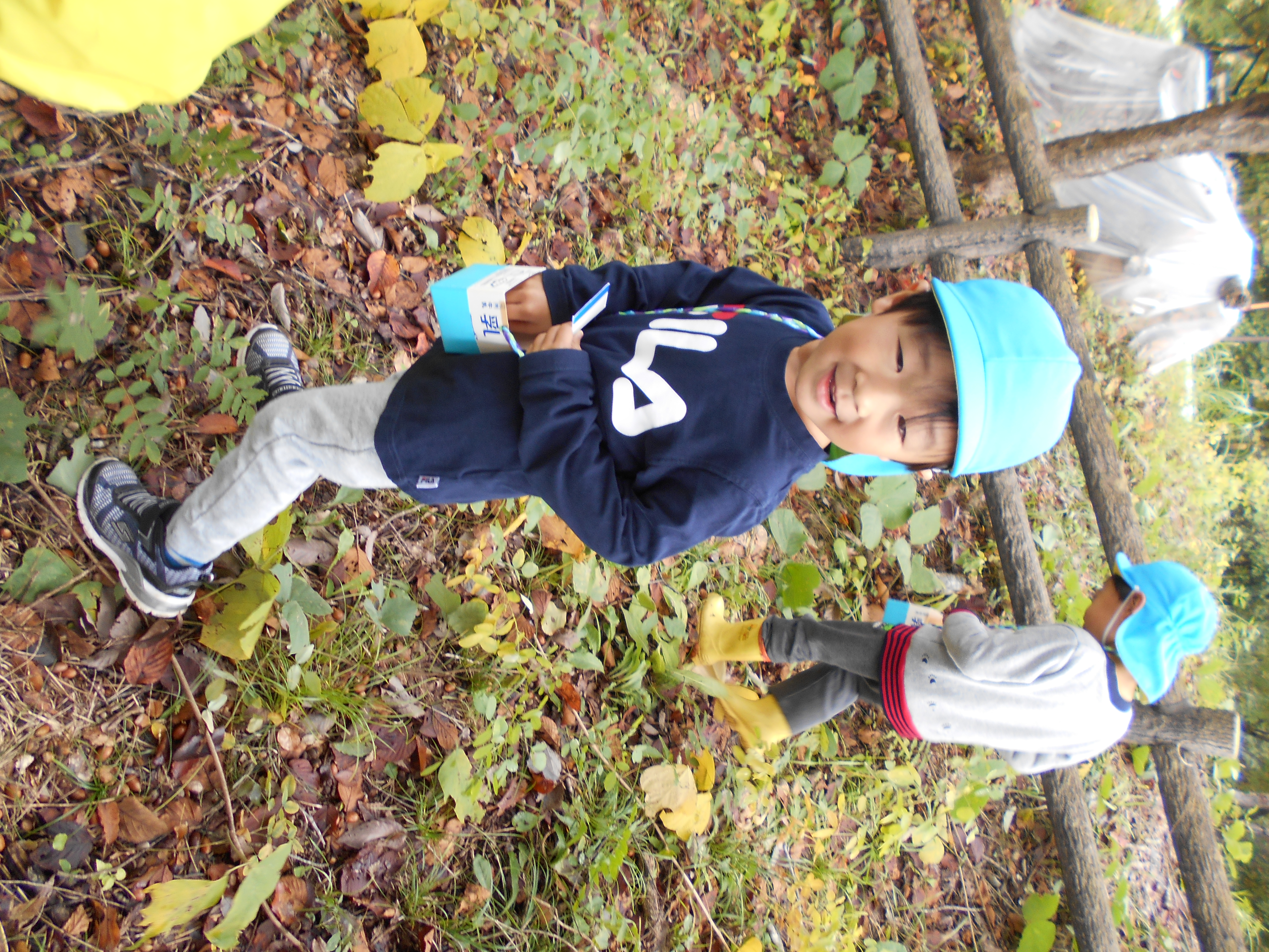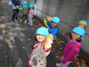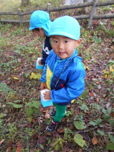 周辺を散策しがてら、建物の横の林に入ると「うわー」と目がキラキラ。「どんぐり見つけた」「いっぱい落ちてる」という声が響きました。中には、きのこを見つけ「食べられるかな」と考えている子。「先生見て」と嬉しそうにお散歩バックからどんぐりを出して見せてくれようとする子(この後「あれ?」と驚いていたのでどうしたのかな?と思っていたら「帽子被ってたのにどっか行っちゃてる。どんぐりさん落としちゃったのかな・・・」と心配して探している暖かい姿も)来る途中に見かけてからずっと探していたけど「くりが欲しい!!」と根気よく探している子。いろいろな子ども達の姿が見られました。