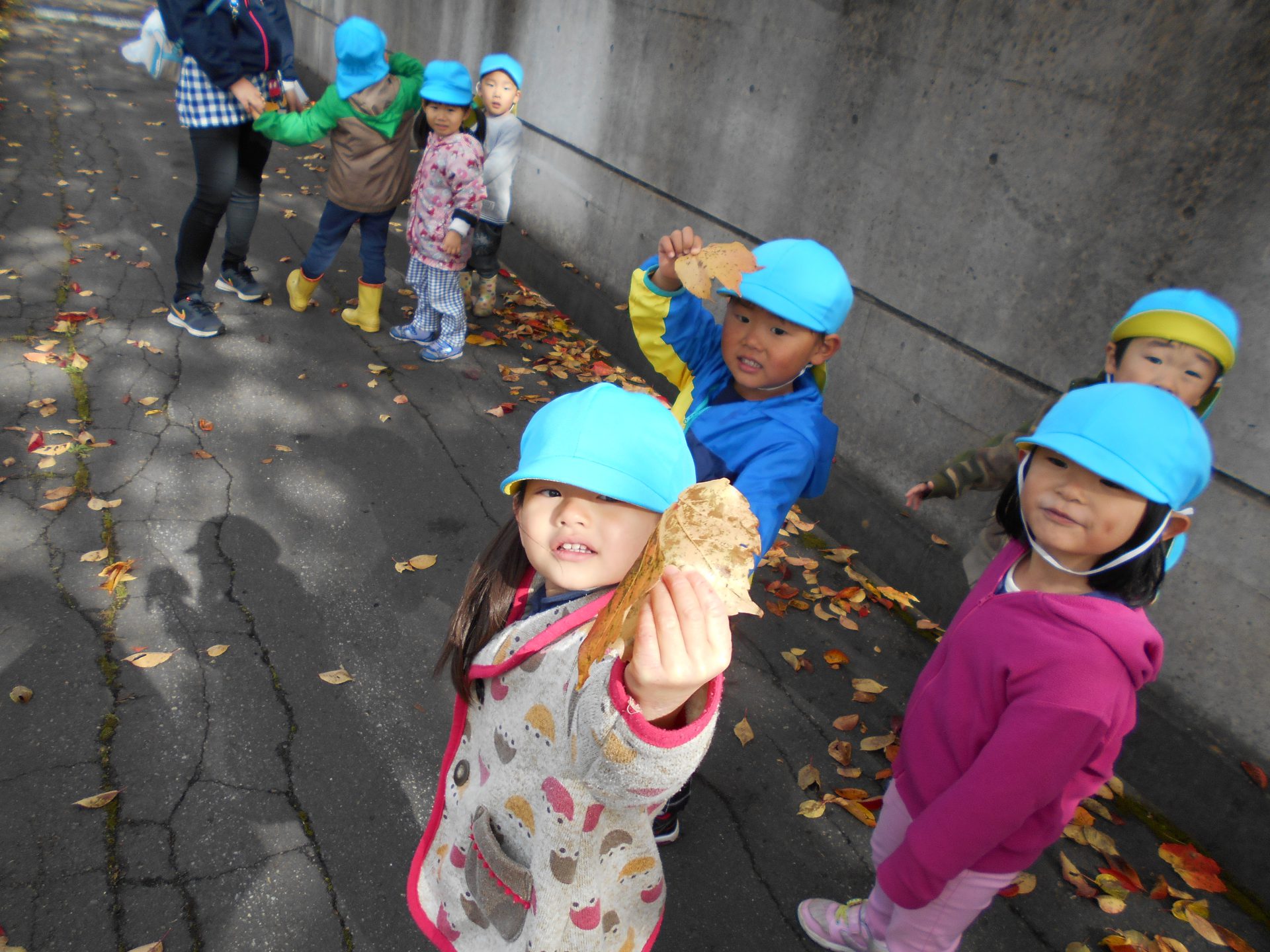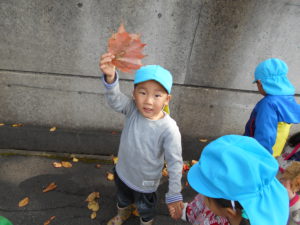 「葉っぱ捕まえるの!」と張り切っていました。それをみた他の子たちは僕も僕もと葉っぱ捕まえ大会が開催されました。ですが、これが中々難しい。みんなで苦戦しました。風に乗ってきた葉っぱは捕まりませんでしたが、落ちている葉っぱもたくさんあることに気付くと手に取って満足そうでした(今度は大きい葉っぱ探し大会になりました)