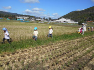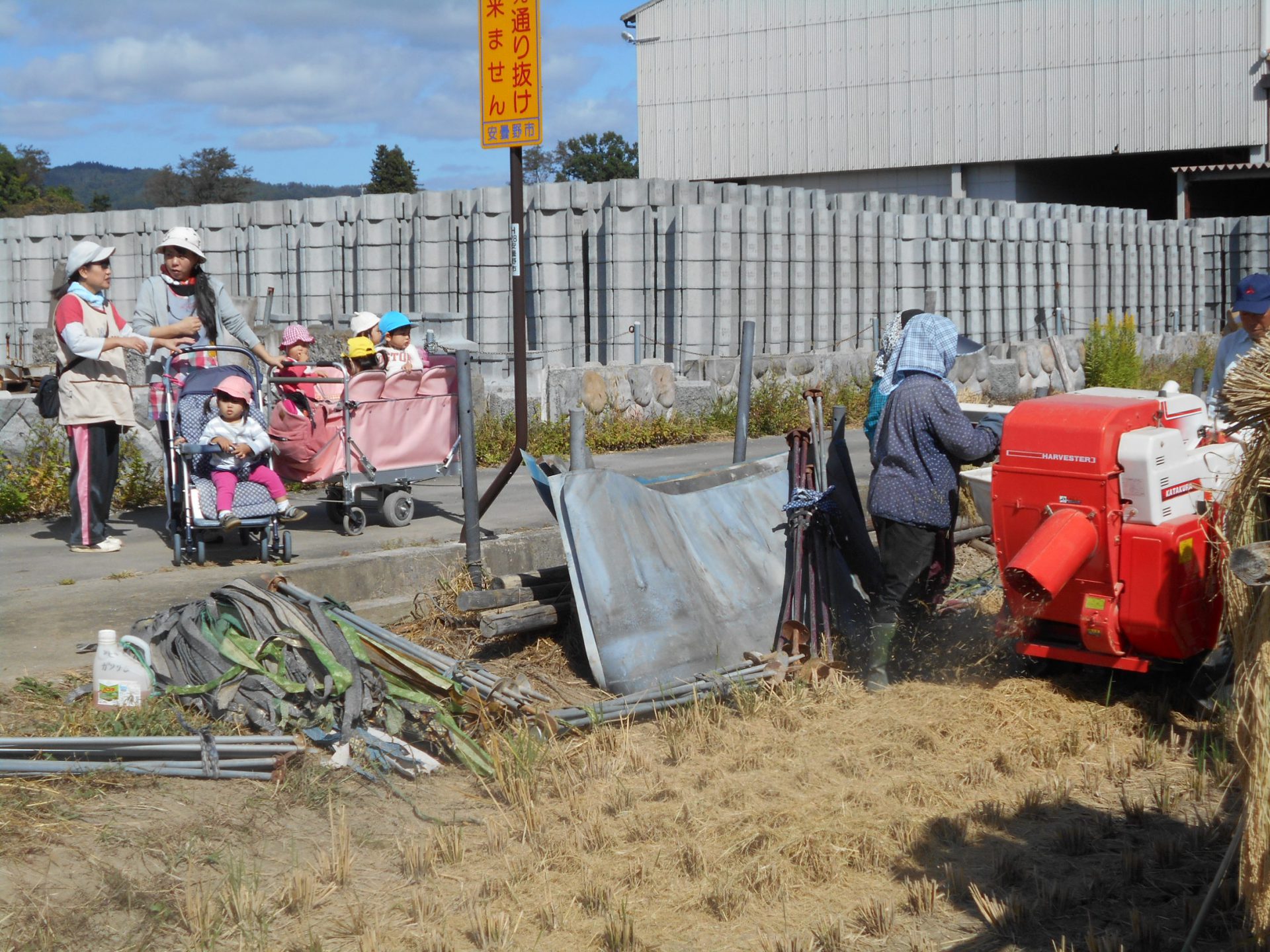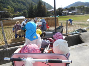 田んぼでは、地域の方が脱穀の真っ最中!大きな音と、裁断機から噴出されるワラに目がクギ付けです。