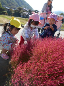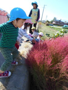 真っ赤に色付き、ひときわ目立つほうき草に吸い寄せられて行く子供たち。