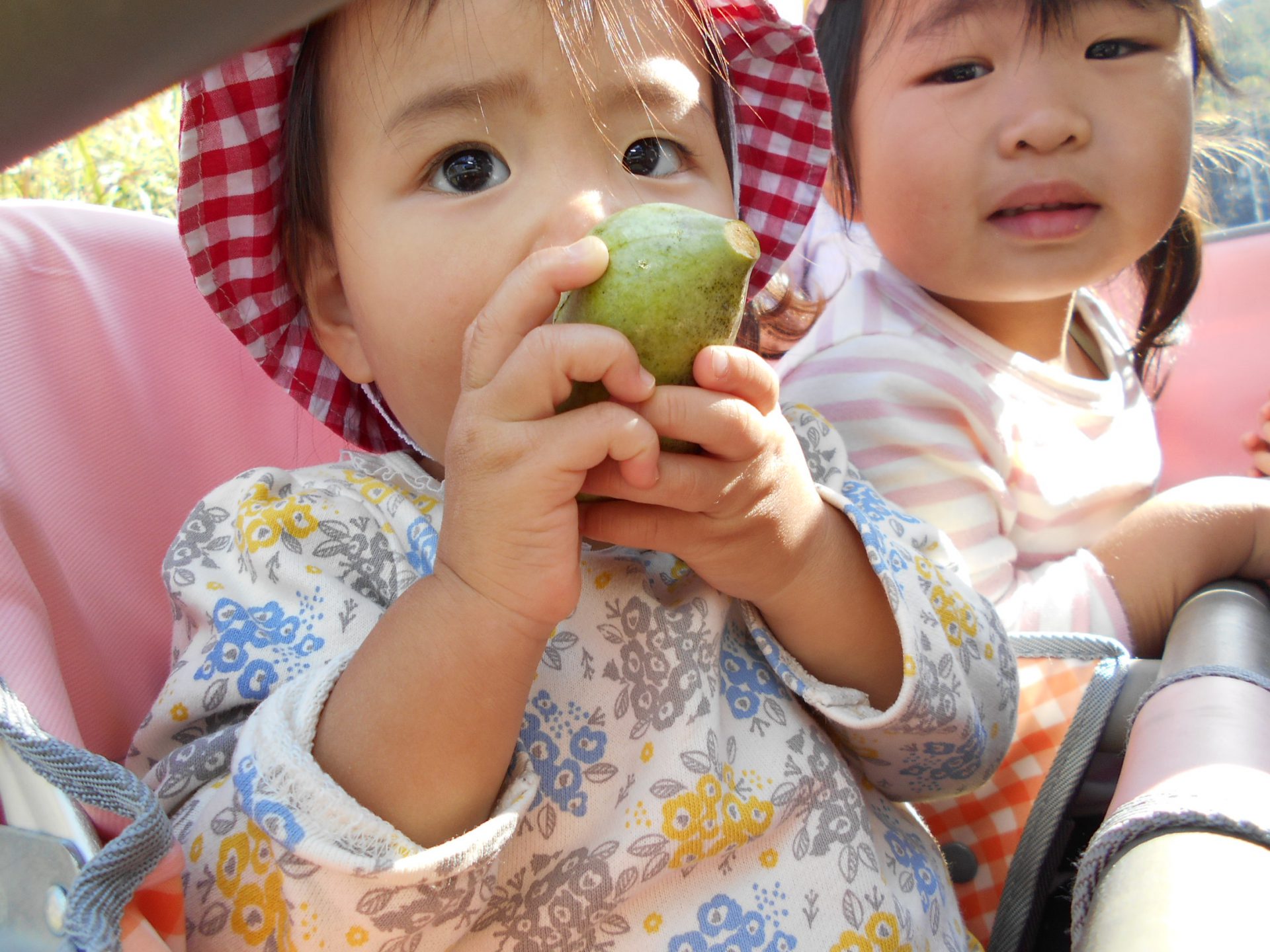 午前のおやつを食べ終えると、サッサッと自分で帽子を被って大好きなお外に出るひよこぐみさん。