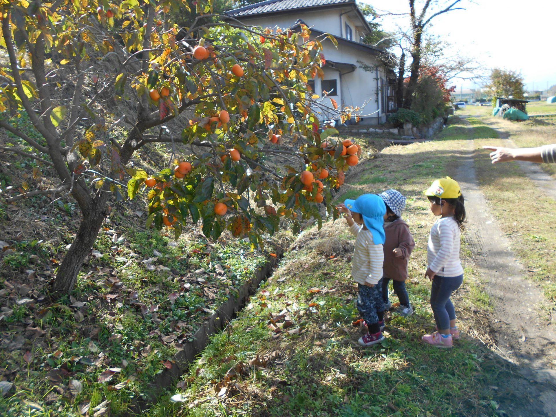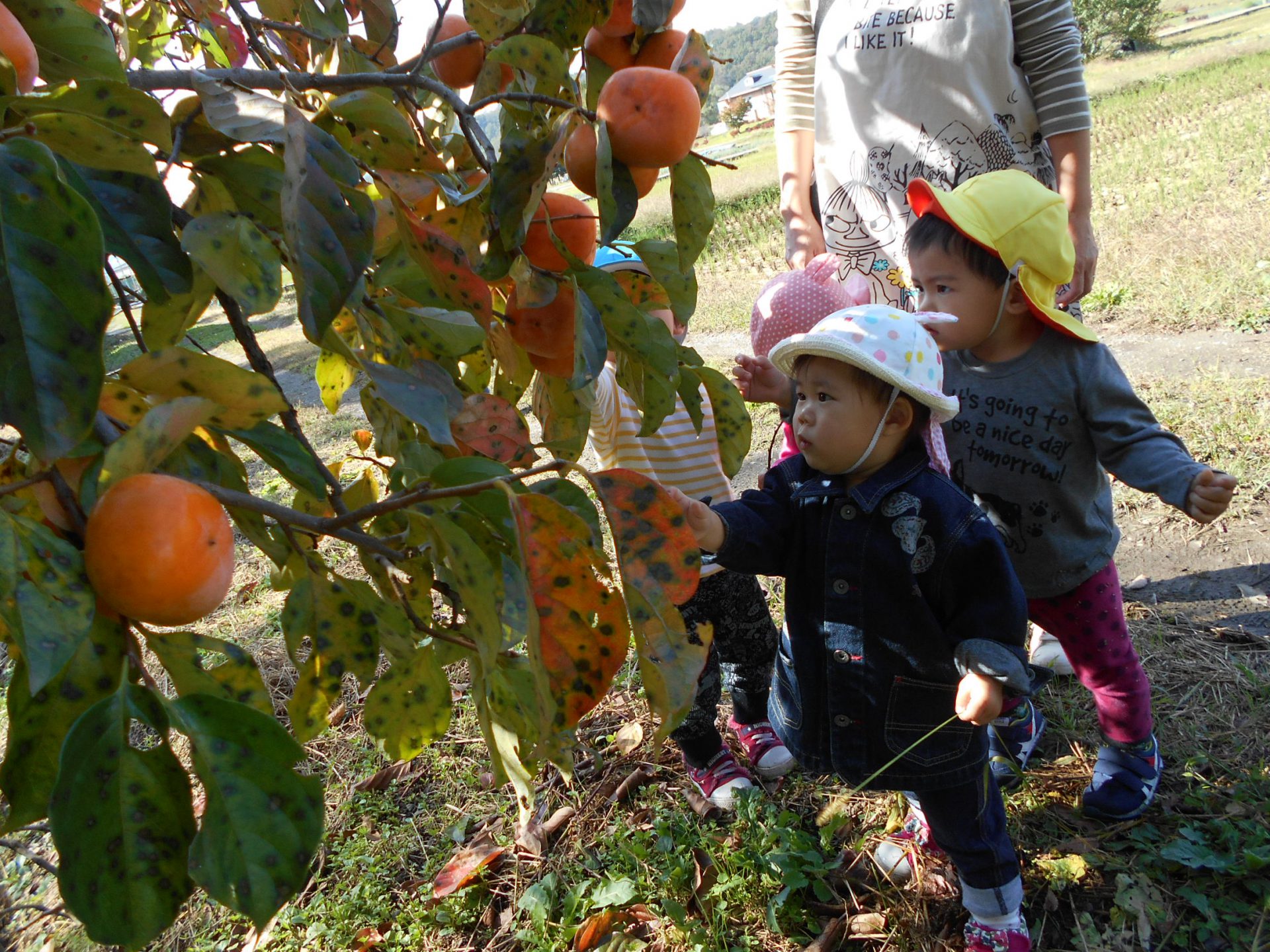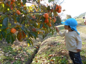 木に実っている柿は、硬くて子どもたちは不思議そう。