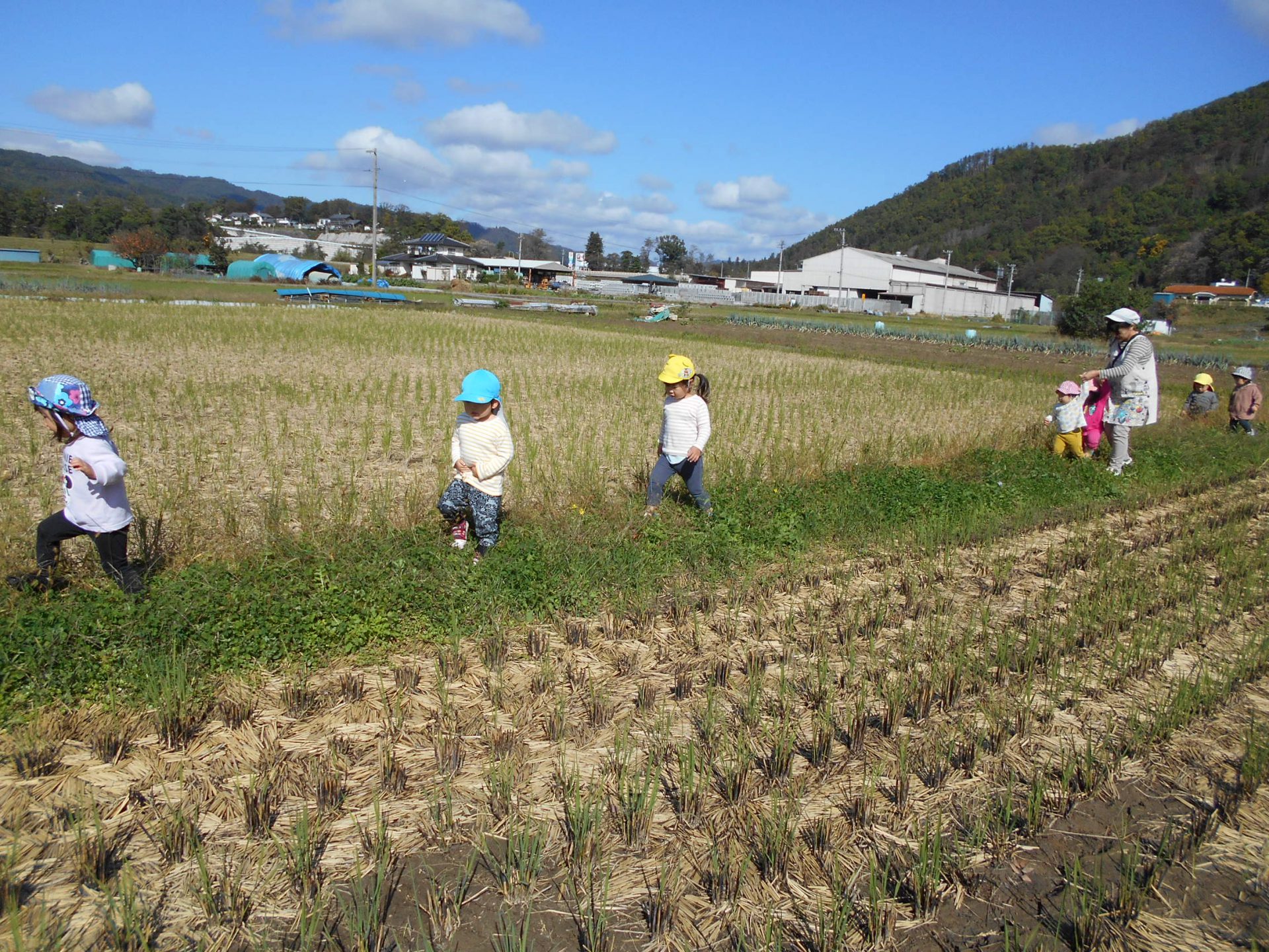 「うわぁー」歓声を上げる子どもたち。 保育士:「ワラのじゅうたんになってるねー」
