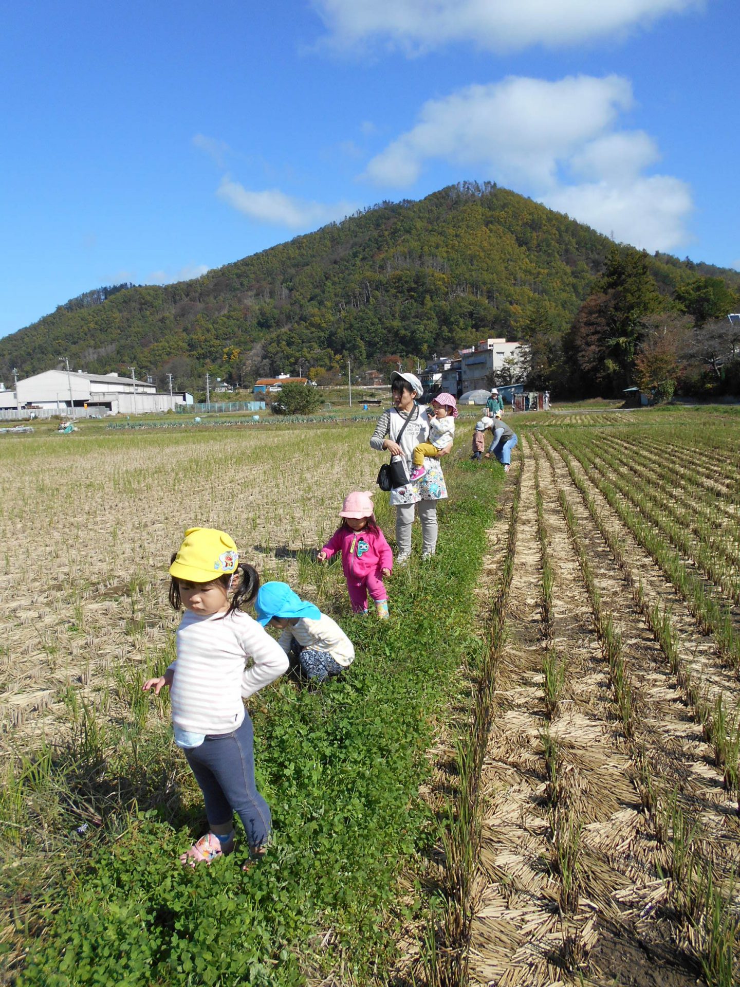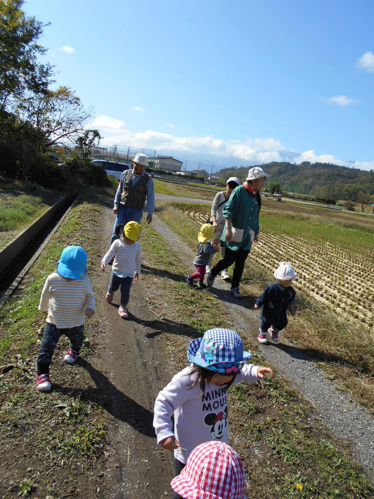 細くてでこぼこのあぜ道に何度もころんで、小さなからだをいっぱい動かして、悪戦苦闘。