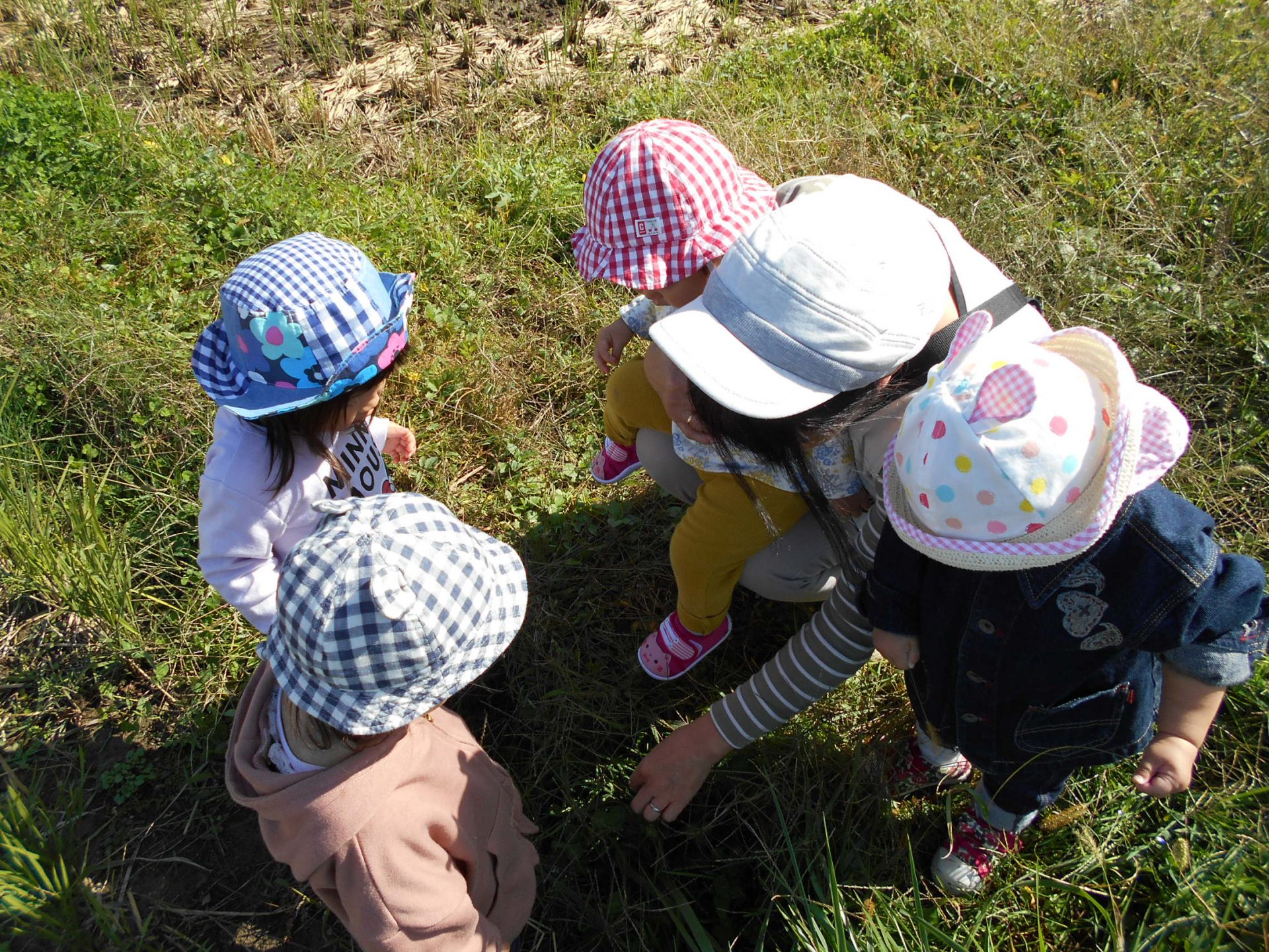 あ、テントウムシを見つけたよ!みんなで覗き込んでいます。