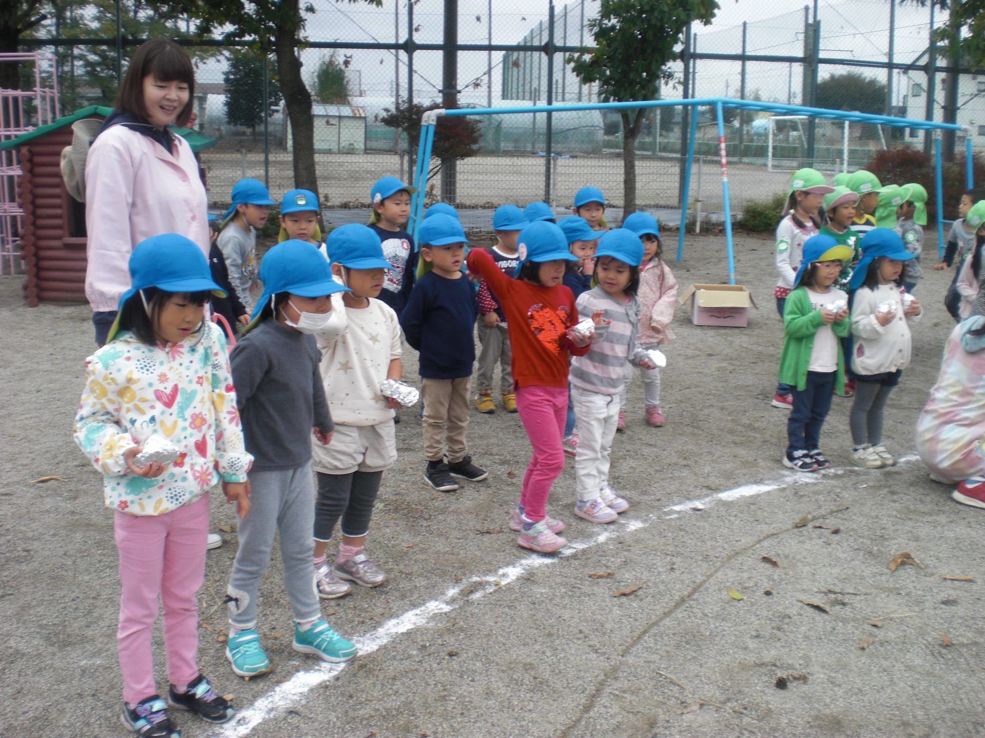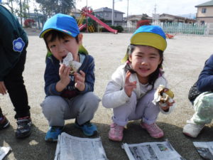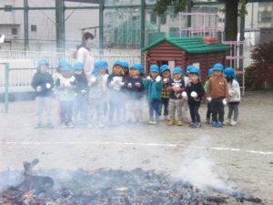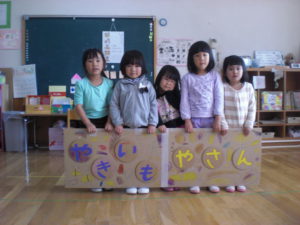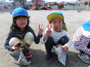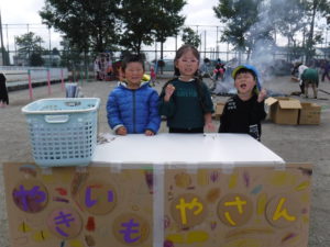 収穫後は昨年自分たちがしてもらったことを思い出し、焼きいも屋さんをやりたいということで、必要なものは何か、どうしたら焼きいもができるか、他の学年にはどうやってお知らせするかなど友だちと話し合って準備し、終わった後は「年中さんありがとう、おいしかったよ」と言われ満足そうな子どもたちでした。
