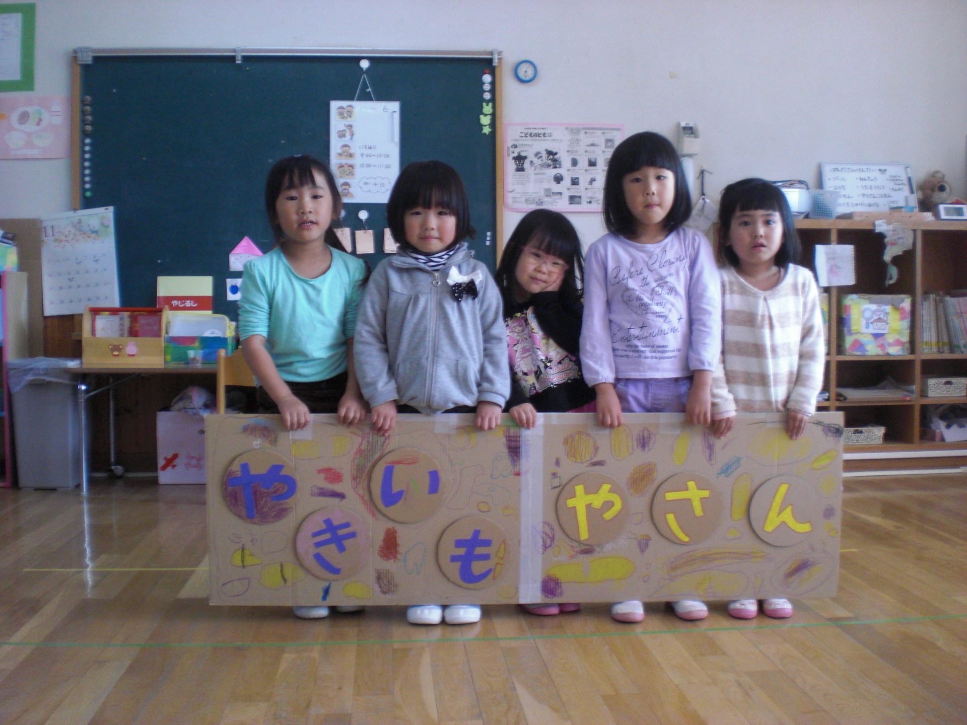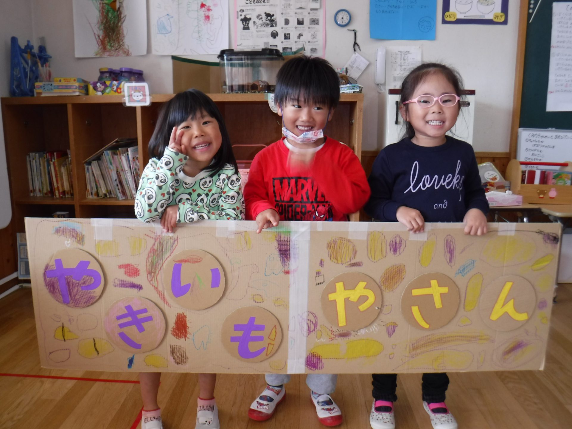 昨年の年長さんたちが焼いも屋さんになってくれた時のことを思い出しながら、「あつくないようにしんぶんのふくろに入れればいいね」「看板がいるよ!」と友だちと話しながら盛り上がっていきました。