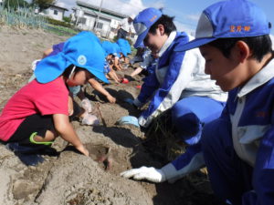 お隣の南安曇農業高校の畑で、お兄さん・お姉さんと一緒に春に植えたさつまいもが大きくなり、おいもほりにも招待してもらいました。