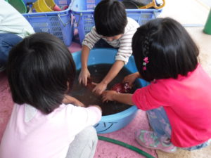 園にはたくさんの畑がありませんが、お隣の南安曇農業高校に誘ってもらったことで、高校生のお兄さんお姉さんとの交流の中で、さつまいもを植える・育てる・収穫する体験をすることができました。植え付けや収穫等、収穫物に対する興味や関心を持つことができたり、高校生との交流や関わりが持てることは貴重な体験でした。