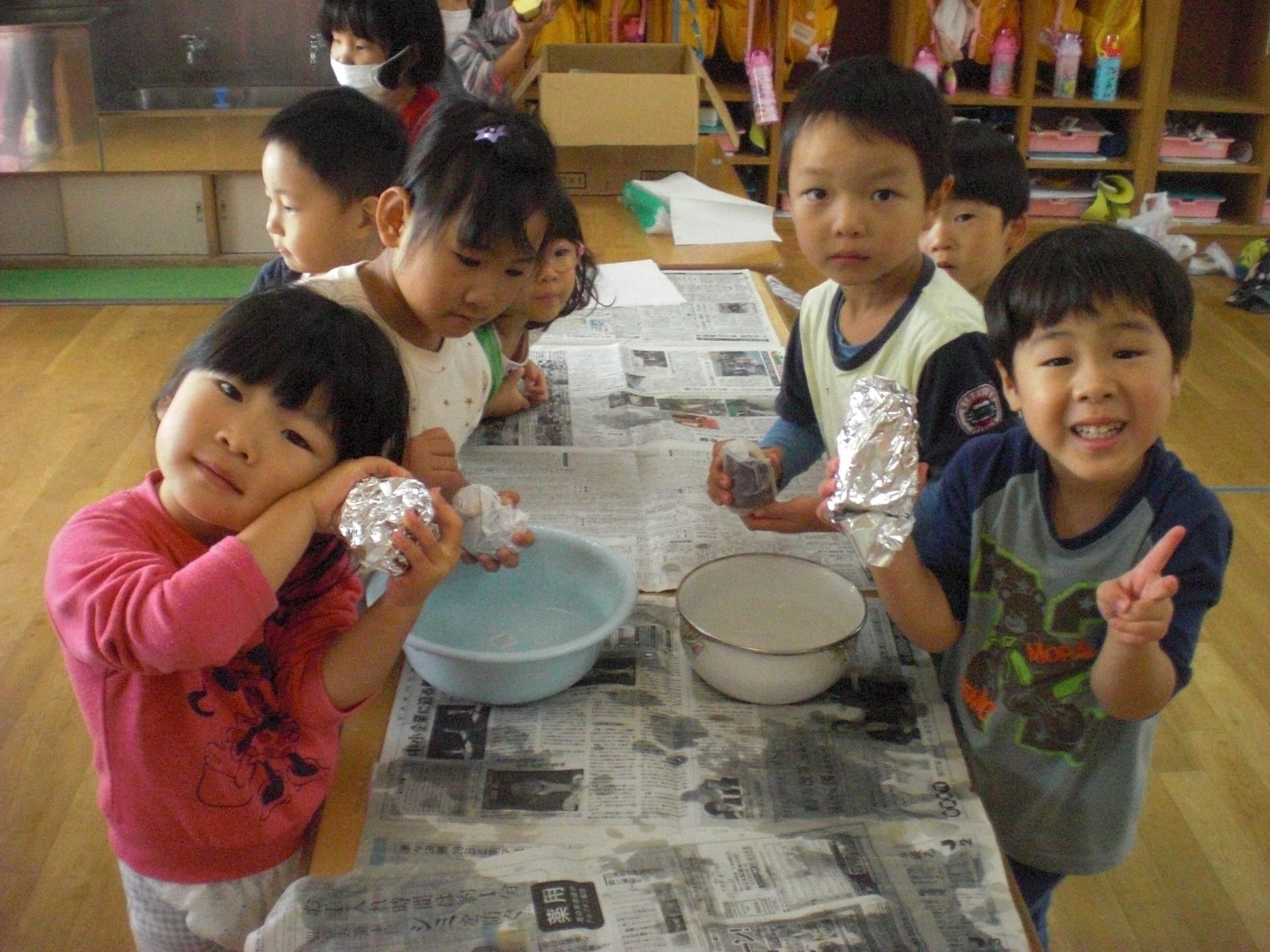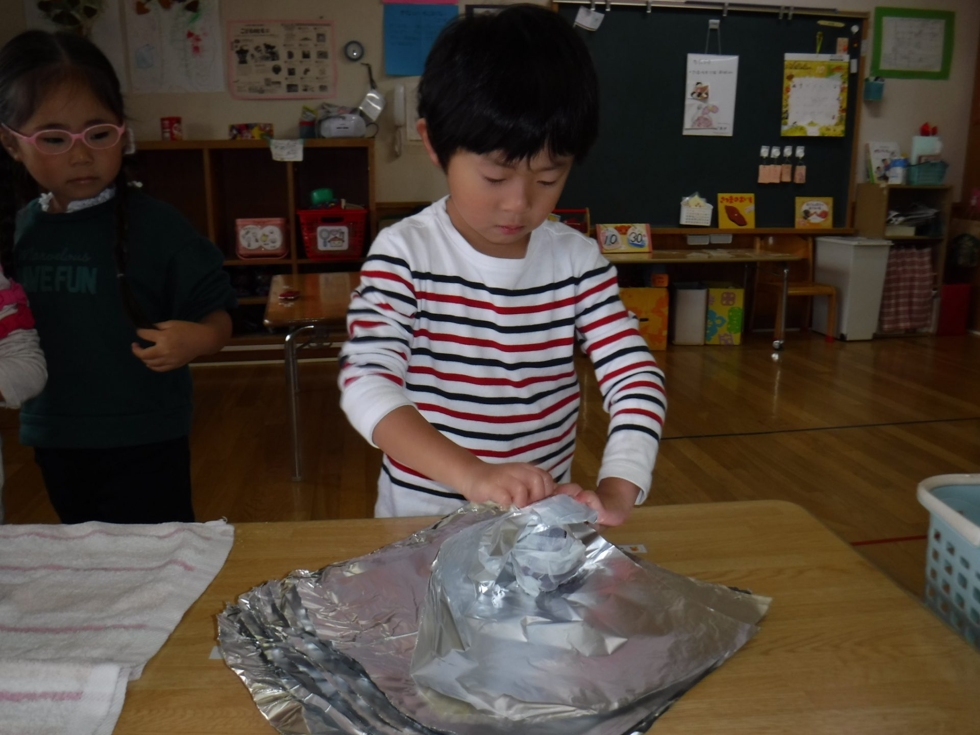 当日の朝は、園のみんなでさつまいもをペーパータオルとアルミホイルで包んで準備万端!
