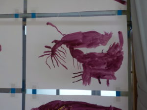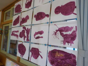 「おひげがあるね。」「ちょっときいろい!?」いろいろな発見をする子どもたち。絵の具でおいもの色を作り、「う~ん、もうちょっと、あかい?」と赤い絵の具を混ぜながら、納得できるまで思い思いに色づくりをする様子がありました。