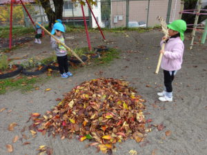 子どもたちの「やってみたい」という気持ちから生まれた落ち葉遊び、大きい熊手や新しく用意した小さい熊手を使って思う存分に楽しんでいました。
